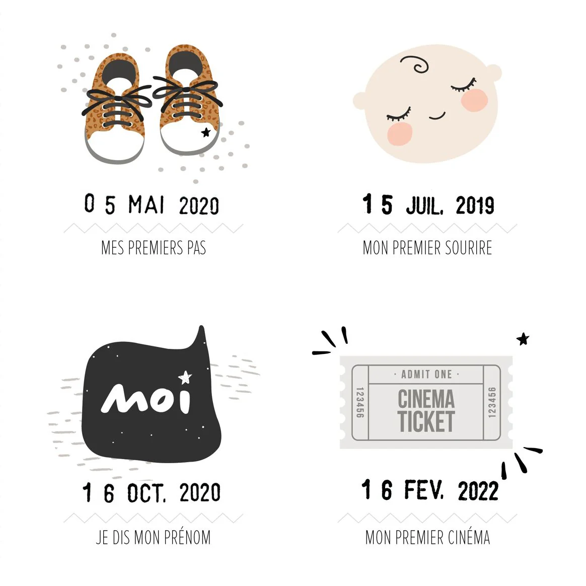Avec l’affiche « Mes premières fois », vous pouvez désormais marquer chaque nouvelle prouesse de votre petit bout. Grâce au tampon dateur vous aurez plus de 60 premières fois à dater. Cette affiche fera également une décoration parfaite dans la chambre de votre enfant.