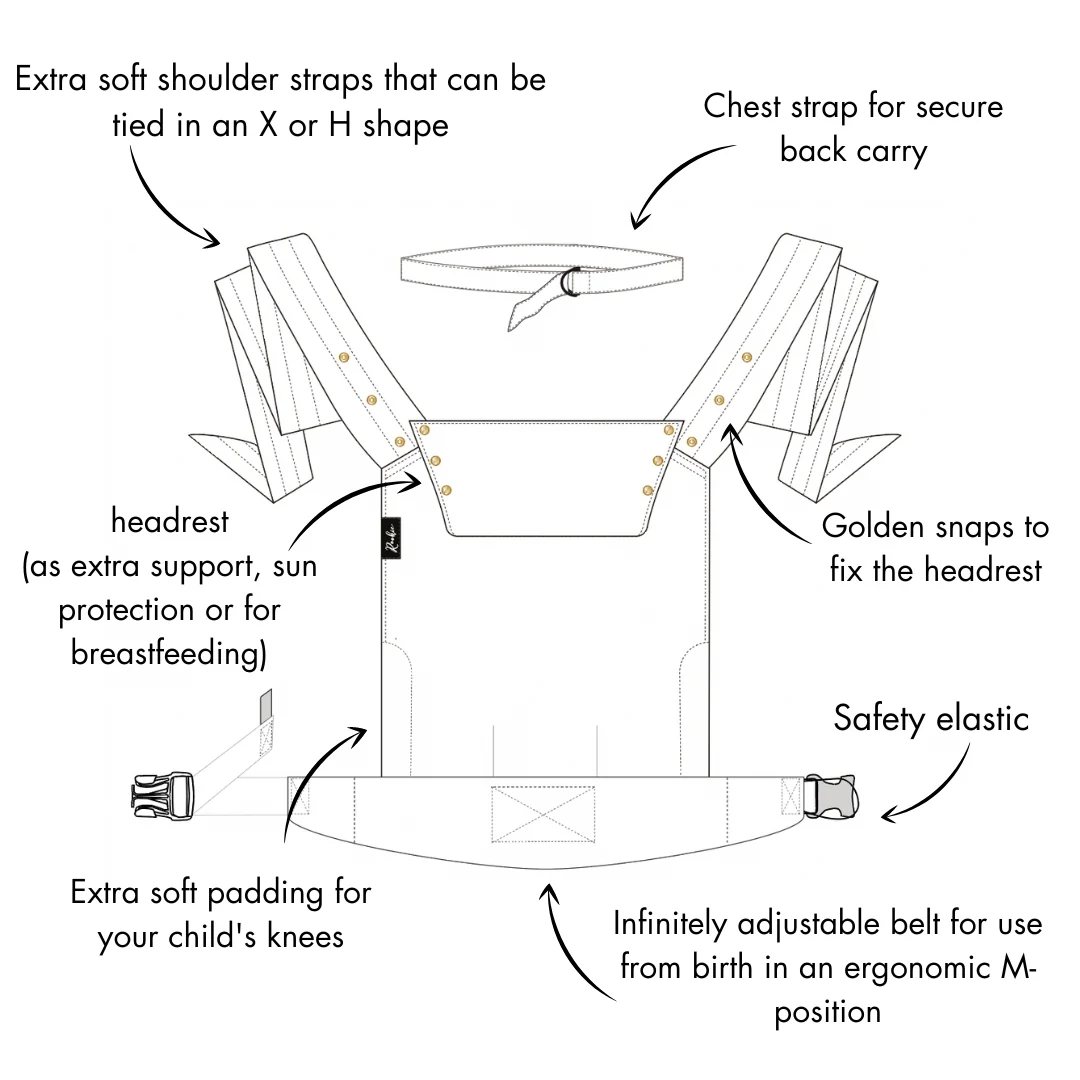 • Élégante sangle de poitrine avec anneau en D en métal doré, permettant de passer facilement de maman à papa