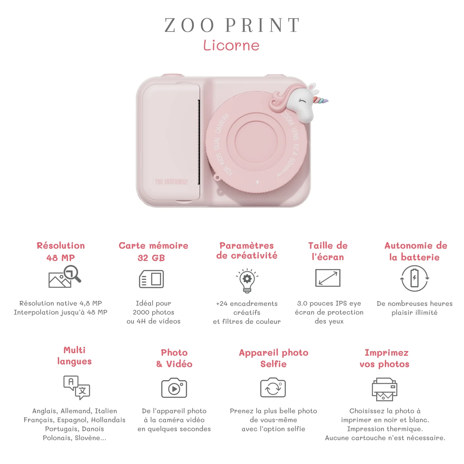 - Vidéo, appareil photo, selfie, impression en un seul appareil