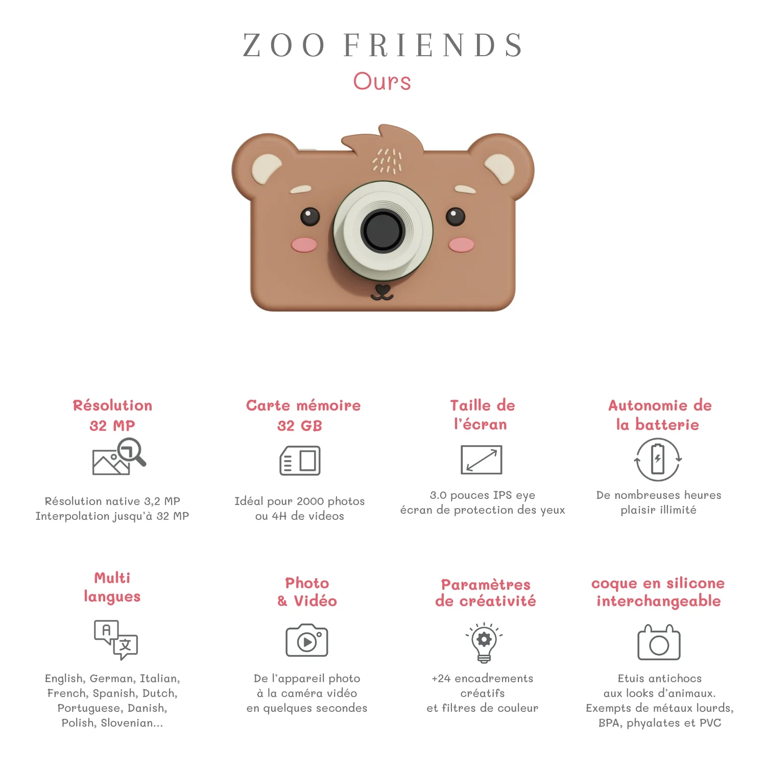 Pensé pour les enfants de 3 à 10 ans, cet appareil photo est multilingue, durable et parfait pour éveiller leur créativité, leur curiosité et leur sens de l’observation.