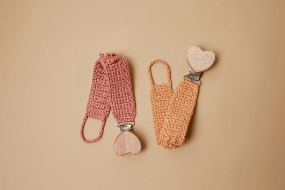 Voici de magnifiques attaches-sucette en crochet et bois d’érable. Un design classique dans des couleurs tendances.