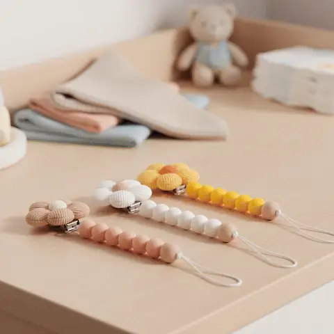 La simplicité d’entretien est essentielle pour les parents occupés. Notre attache tetine se nettoie en un clin d’œil : un simple lavage à l’eau tiède savonneuse suffit pour éliminer les germes et maintenir une hygiène parfaite. Les matériaux résistants supportent des nettoyages fréquents sans perdre leur éclat ni leur qualité. Contrairement aux attaches en tissu qui peuvent rester humides et devenir un terrain favorable aux bactéries, nos modèles en bois et silicone sèchent rapidement et restent propres plus longtemps.