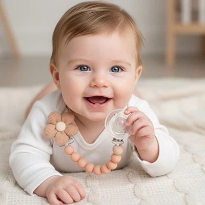 Votre bébé mérite un accessoire aussi beau que pratique, n’est-ce pas ? Nos attaches tetine sont conçues avec des perles en bois et silicone de différentes textures et couleurs pastel douces. Ces éléments ne sont pas seulement décoratifs : ils deviennent un véritable jouet sensoriel qui accompagne le développement tactile de votre enfant. L’élément floral distinctif en silicone souple au sommet du cordon attire l’attention et permet à bébé de saisir facilement son attache, stimulant ainsi sa motricité fine.