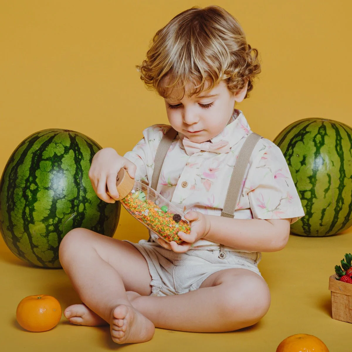 Chaque fois que la bouteille est secouée, c’est comme si la récolte commençait ! Mandarines, raisins, bananes, fraises… une véritable farandole de fruits apparaît. Encouragez votre enfant à observer, deviner et identifier ses fruits préférés tout en s’amusant !