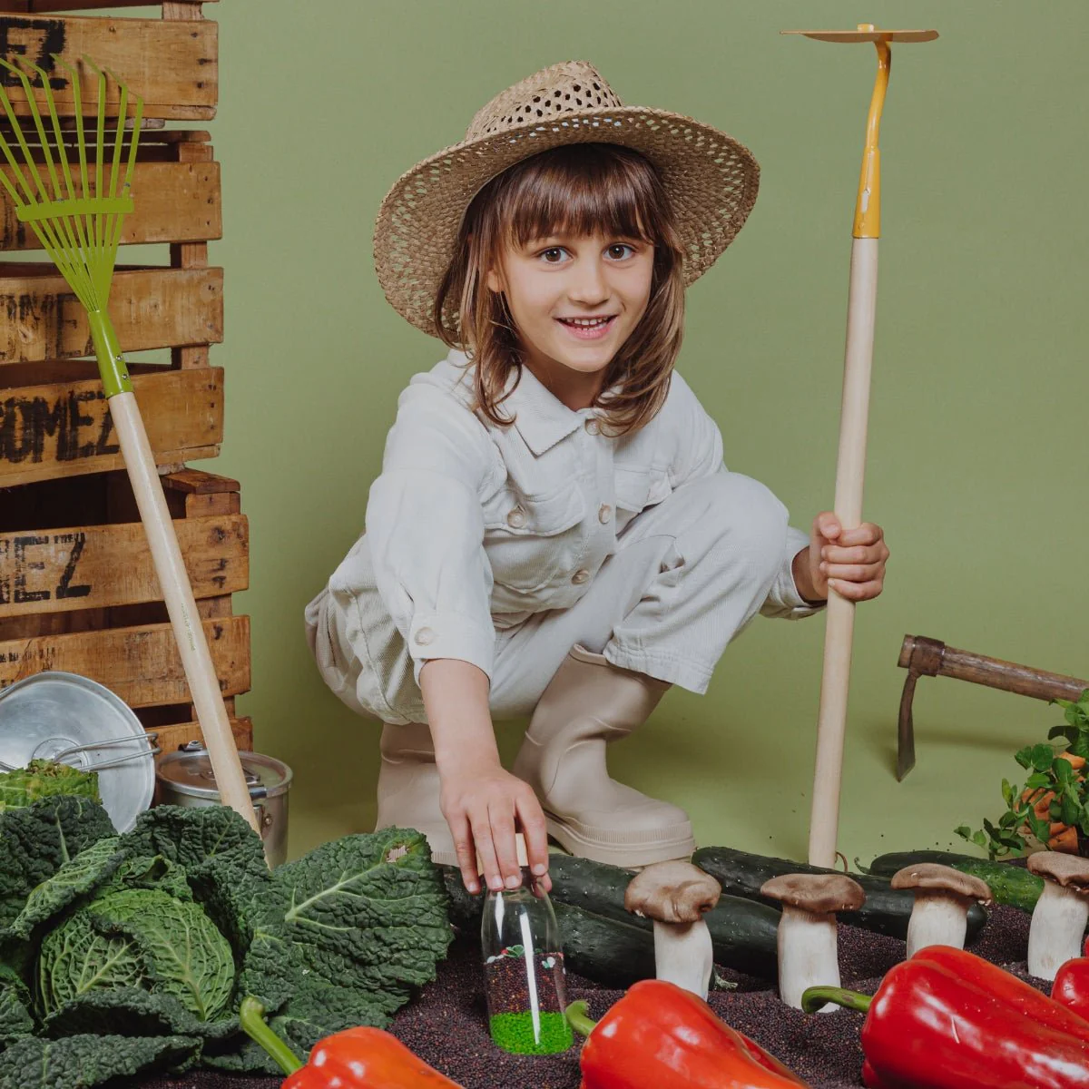Chaque fois que la bouteille est secouée, c’est comme si la récolte commençait ! Salade, chou-fleur, carotte, poivron,… une véritable farandole de légumes apparaît. Encouragez votre enfant à observer, deviner et identifier ses légumes préférés tout en s’amusant !