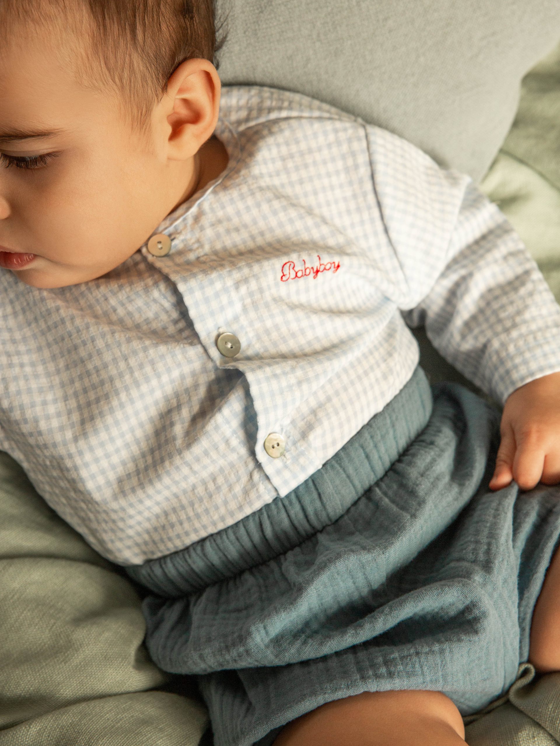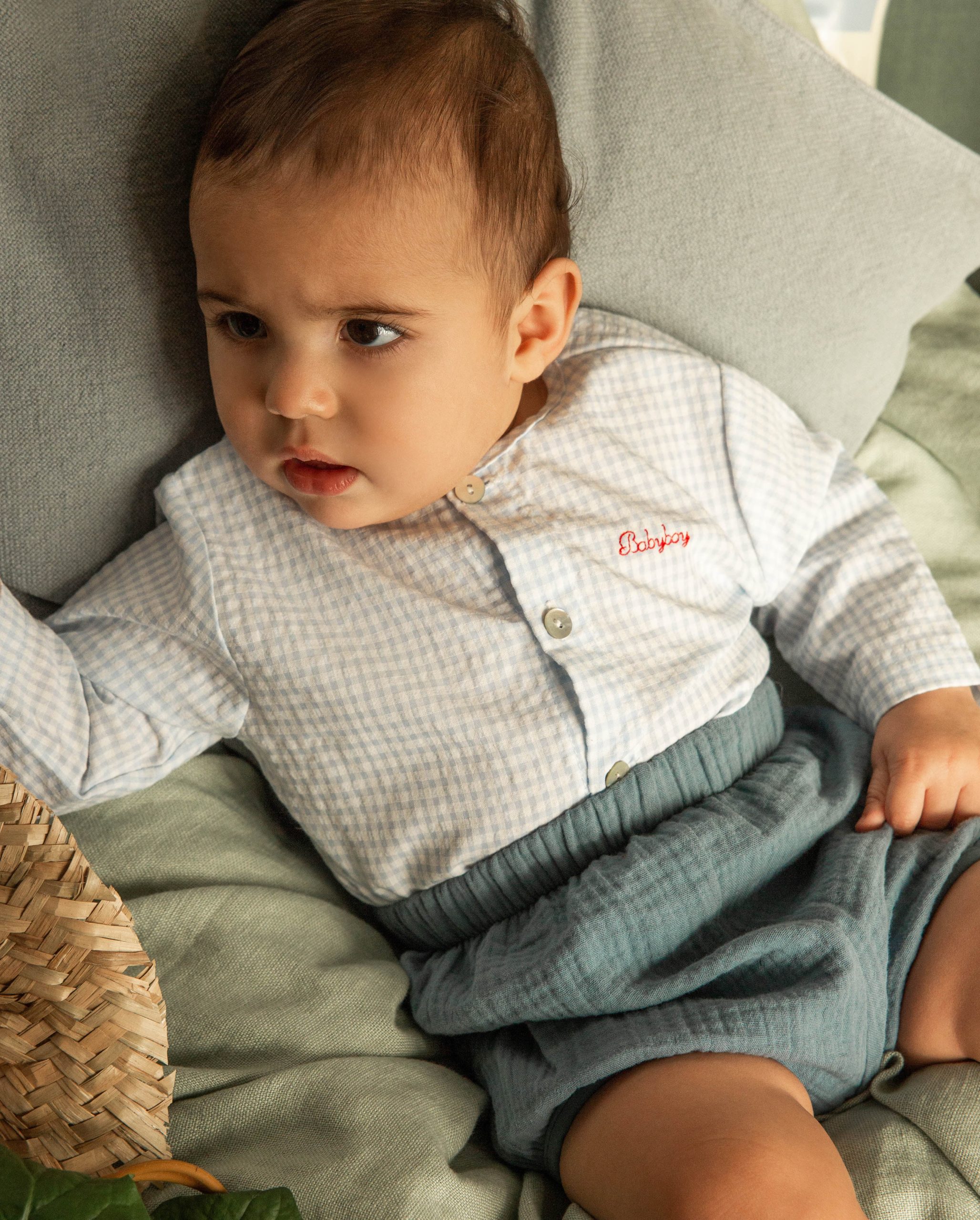 Chemise manches longues. Ouverture à l’avant par des boutons en nacre naturelle.Merci de noter qu’à partir du 1er Mars, nos vêtements enfant ne pourront plus être brodés ou personnalisés.
