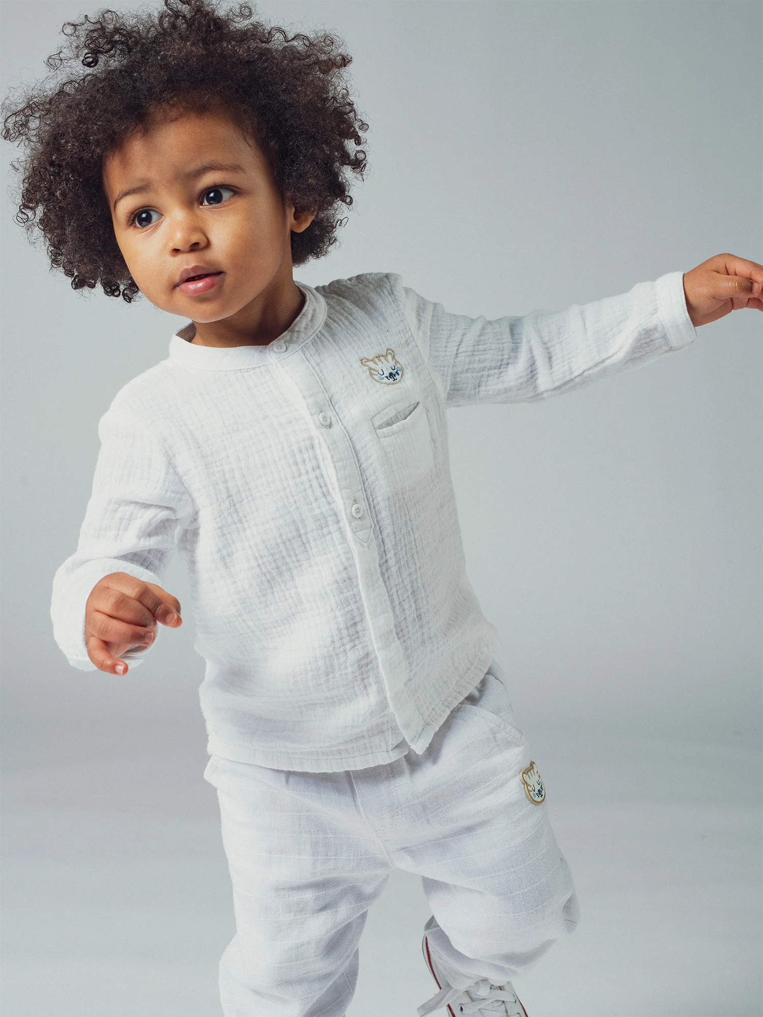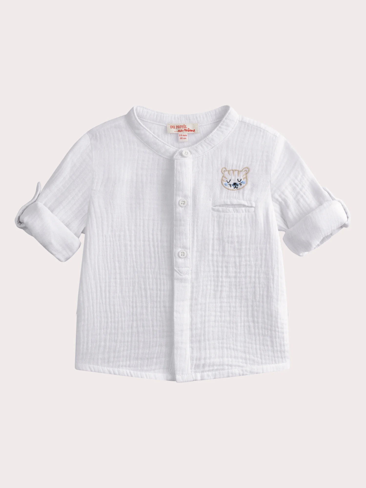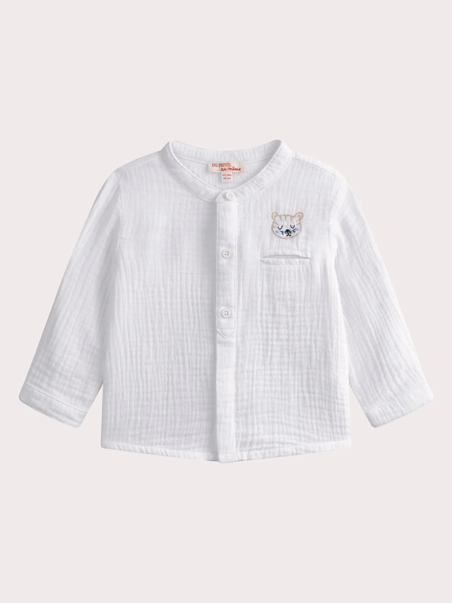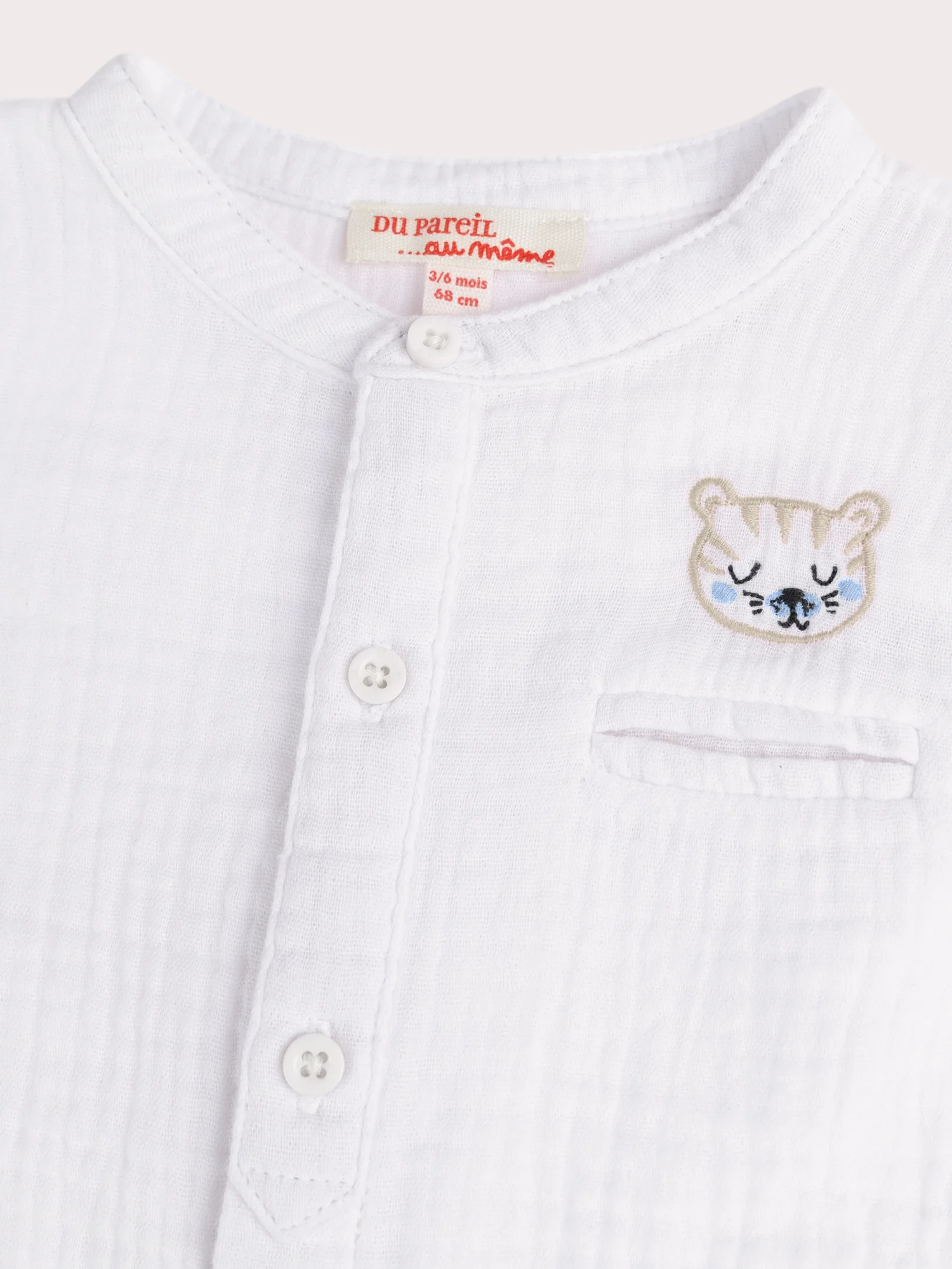 Cette chemise blanche pour bébé garçon, en double gaze de coton, allie confort et style. Elle présente un col mao élégant et une petite poche passepoilée sur la poitrine, décorée d’une broderie de tête de tigre. Un vêtement parfait pour un look à la fois chic et décontracté.