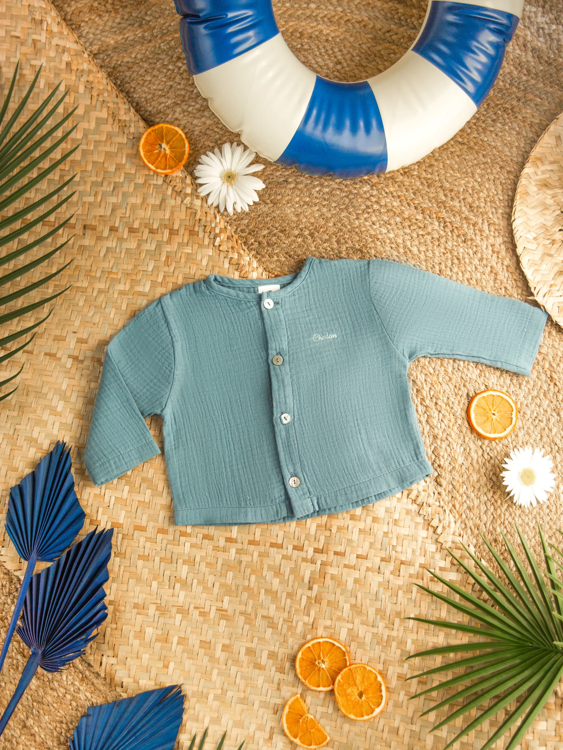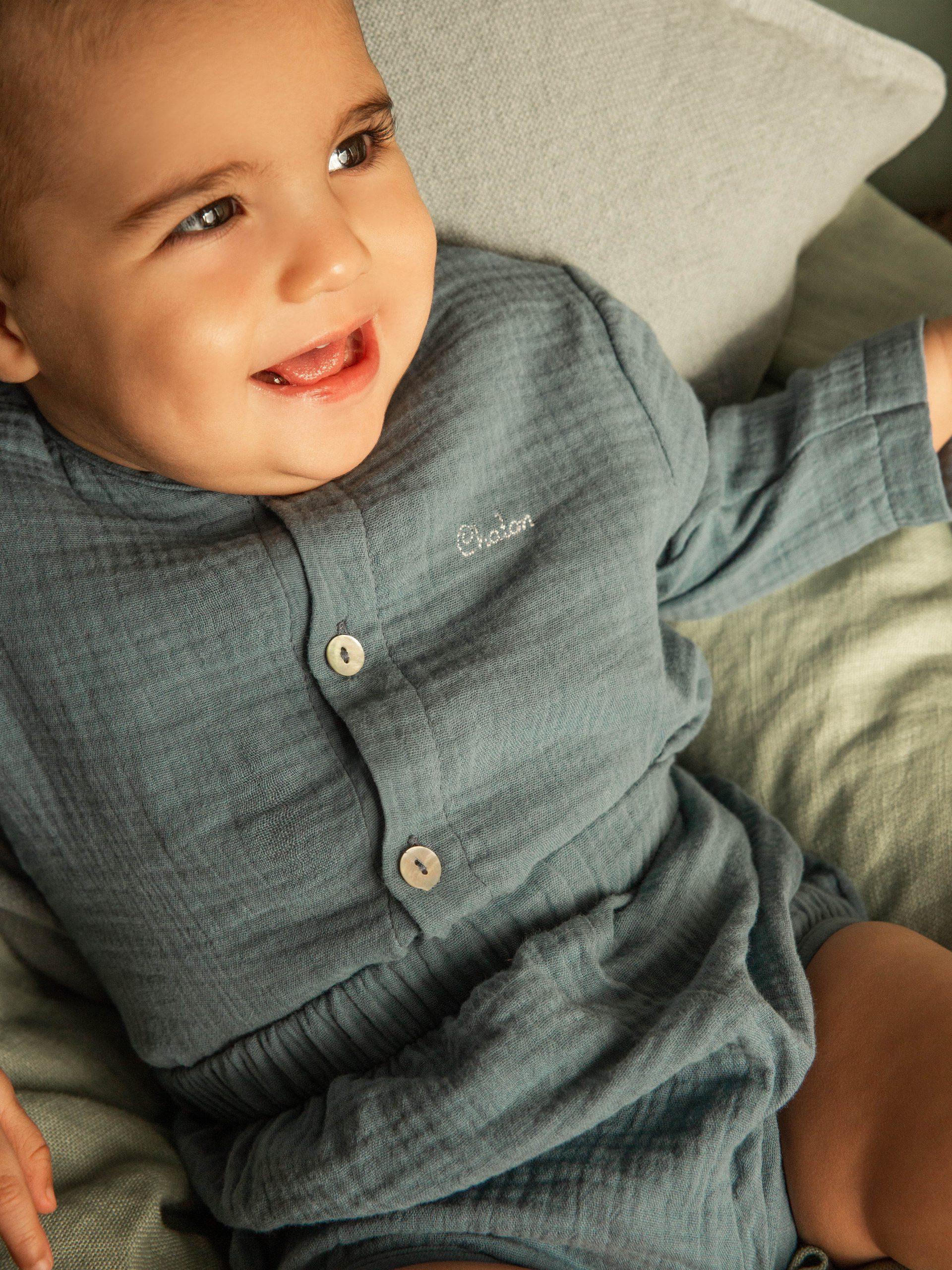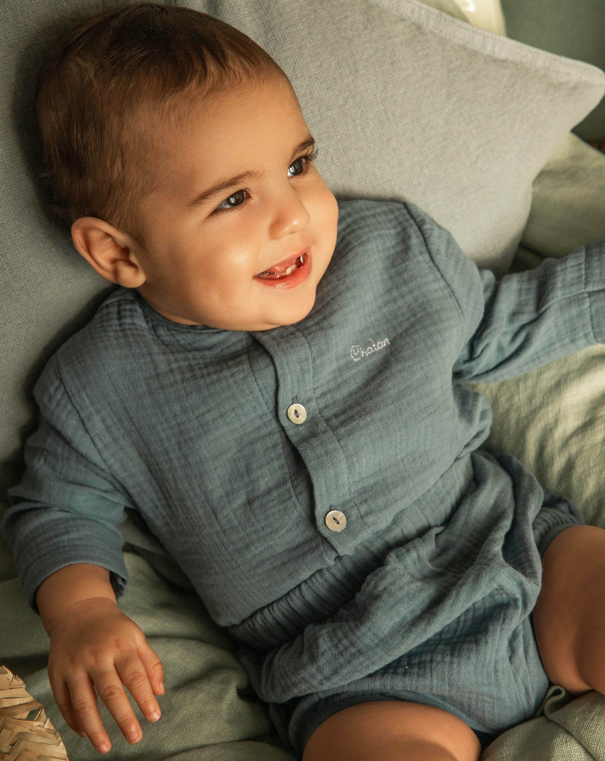 Chemise manches longues. Ouverture à l’avant par des boutons en nacre naturelle.Merci de noter qu’à partir du 1er Mars, nos vêtements enfant ne pourront plus être brodés ou personnalisés.