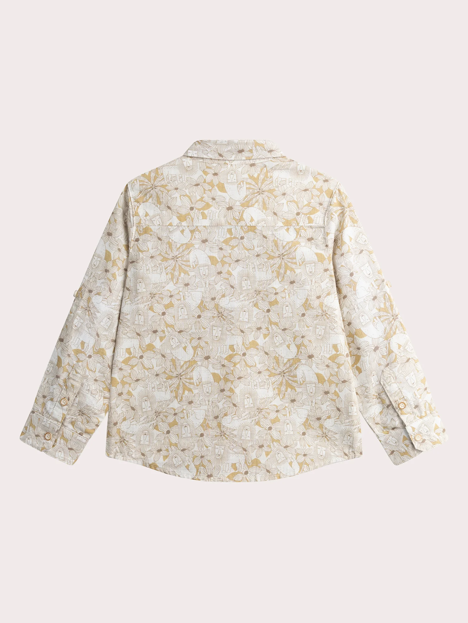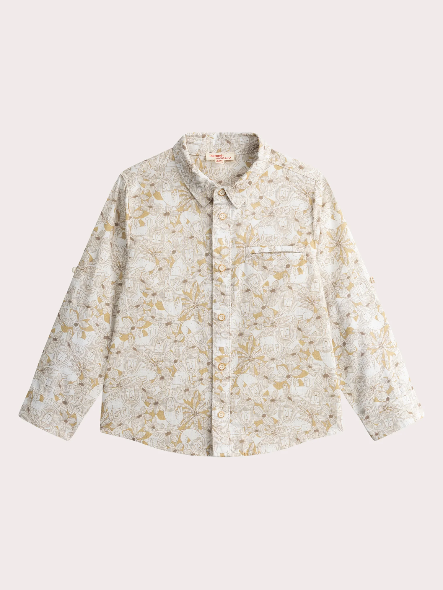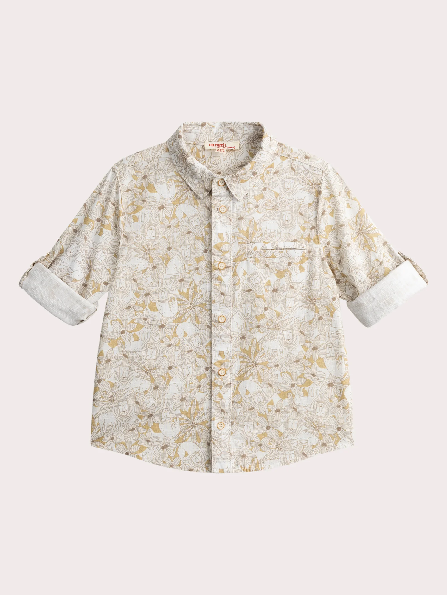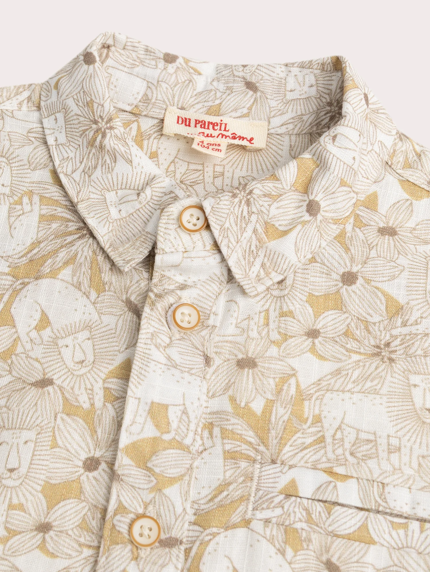 Cette chemise à manches longues est idéale pour les enfants aventuriers, à porter tout au long de l’année. Confectionnée en lin léger, elle offre un confort optimal et des manches retroussables pour une touche pratique. L’imprimé lions, associé à une poche avant passepoilée, apporte un style amusant et audacieux à la tenue.