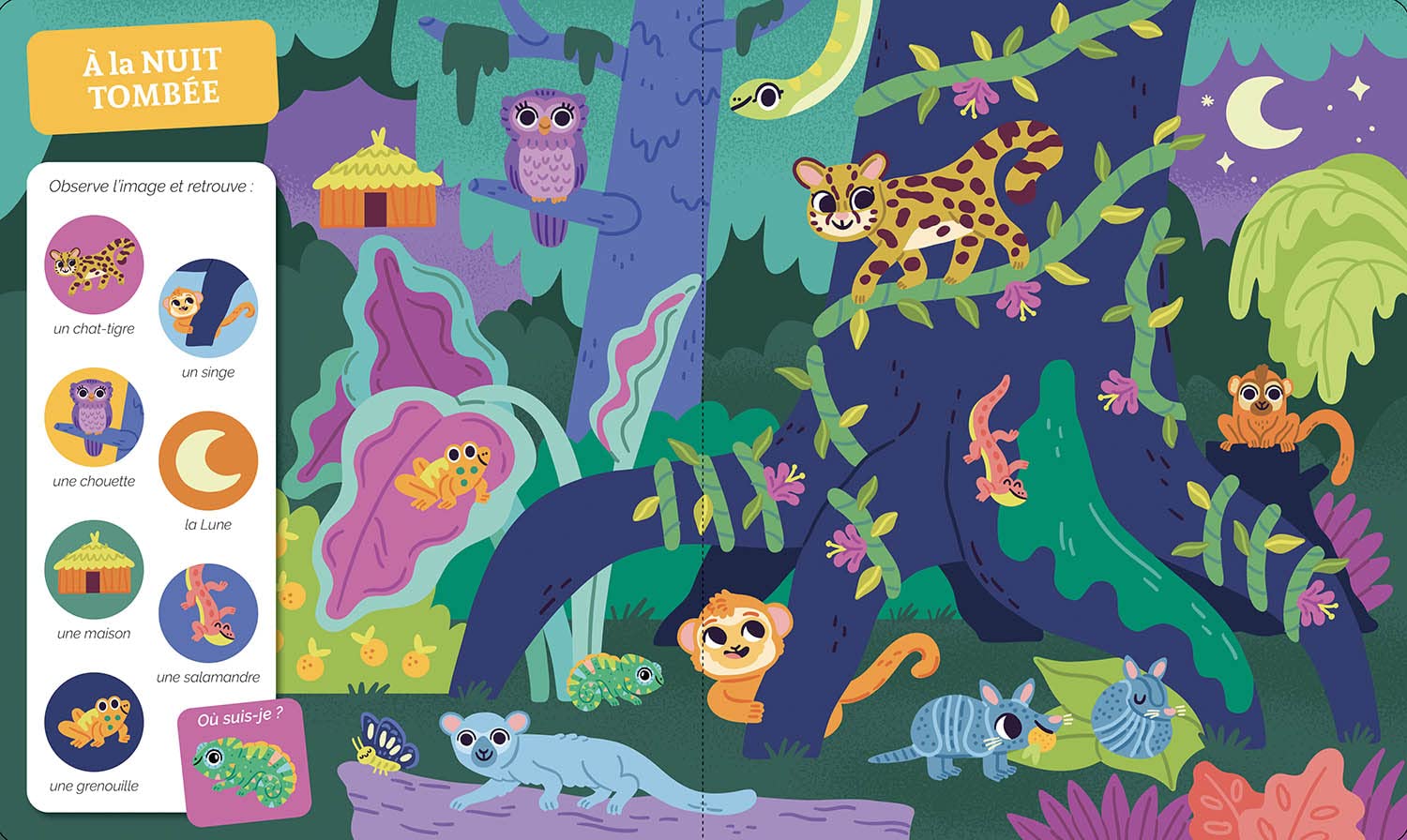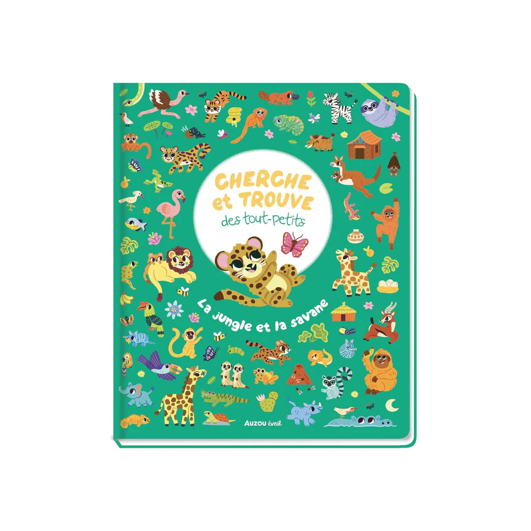 À travers 9 pages foisonnantes de détails, les petits partent à l’exploration de la Jungle et de la Savane. Ils observent attentivement et retrouvent 7 éléments (+ la mascotte) bien cachés sur chaque page.