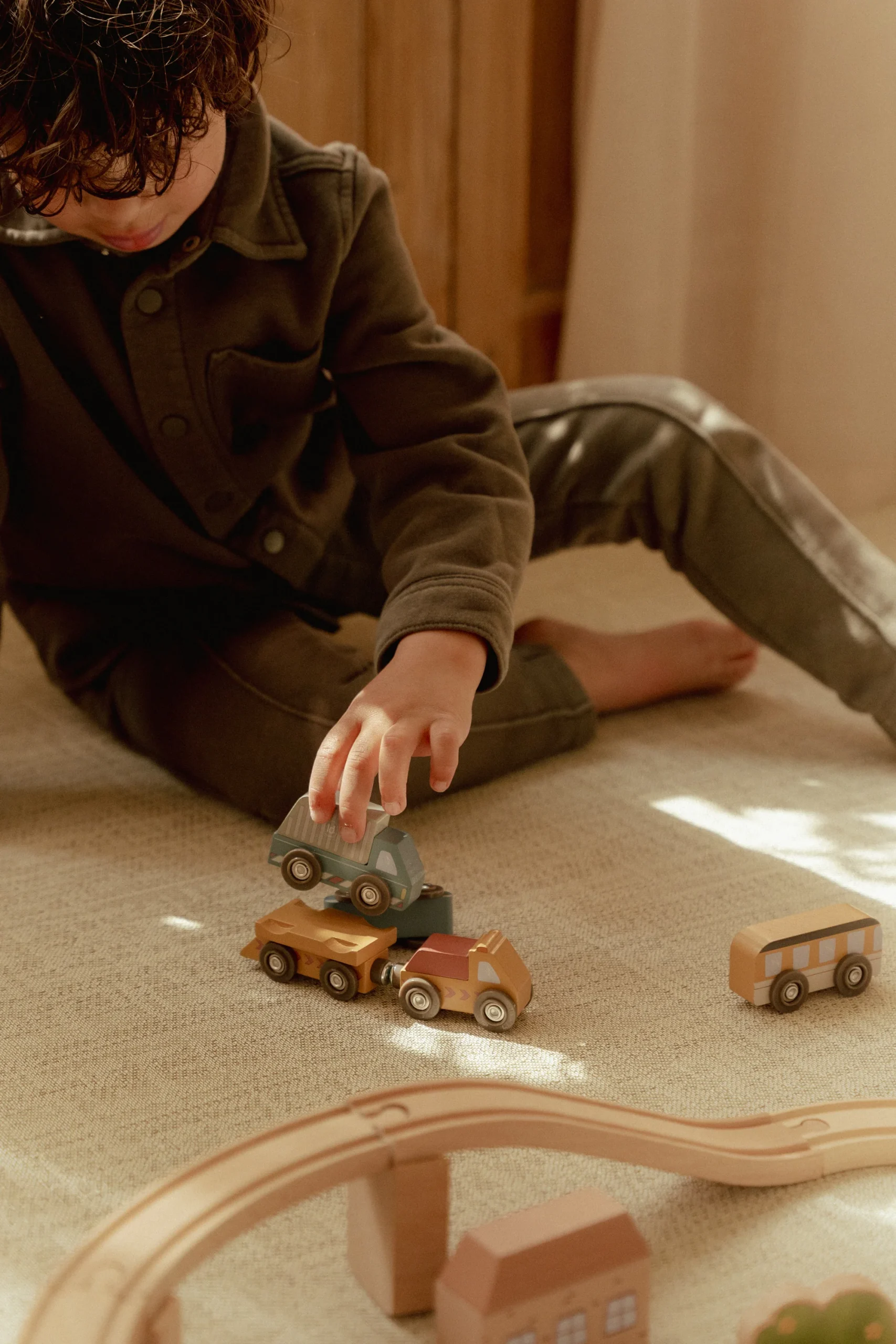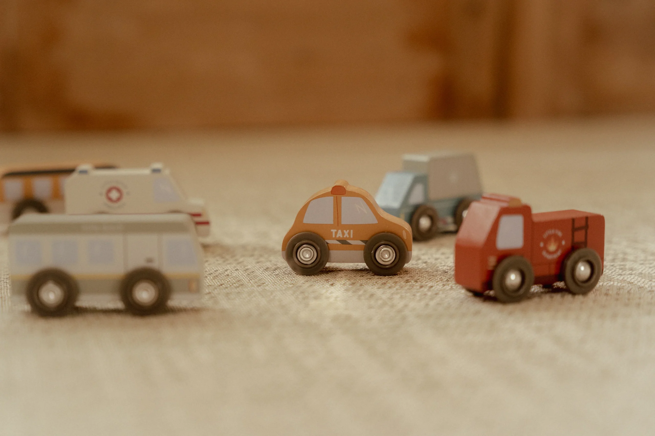 Ces véhicules en bois (pompiers, police, ambulance, camion et camionnette de livraison) sont prêts à intervenir à tout moment. Conçus pour rouler sans effort sur les rails, ils apportent de l’aide et de l’action dans toutes les situations.