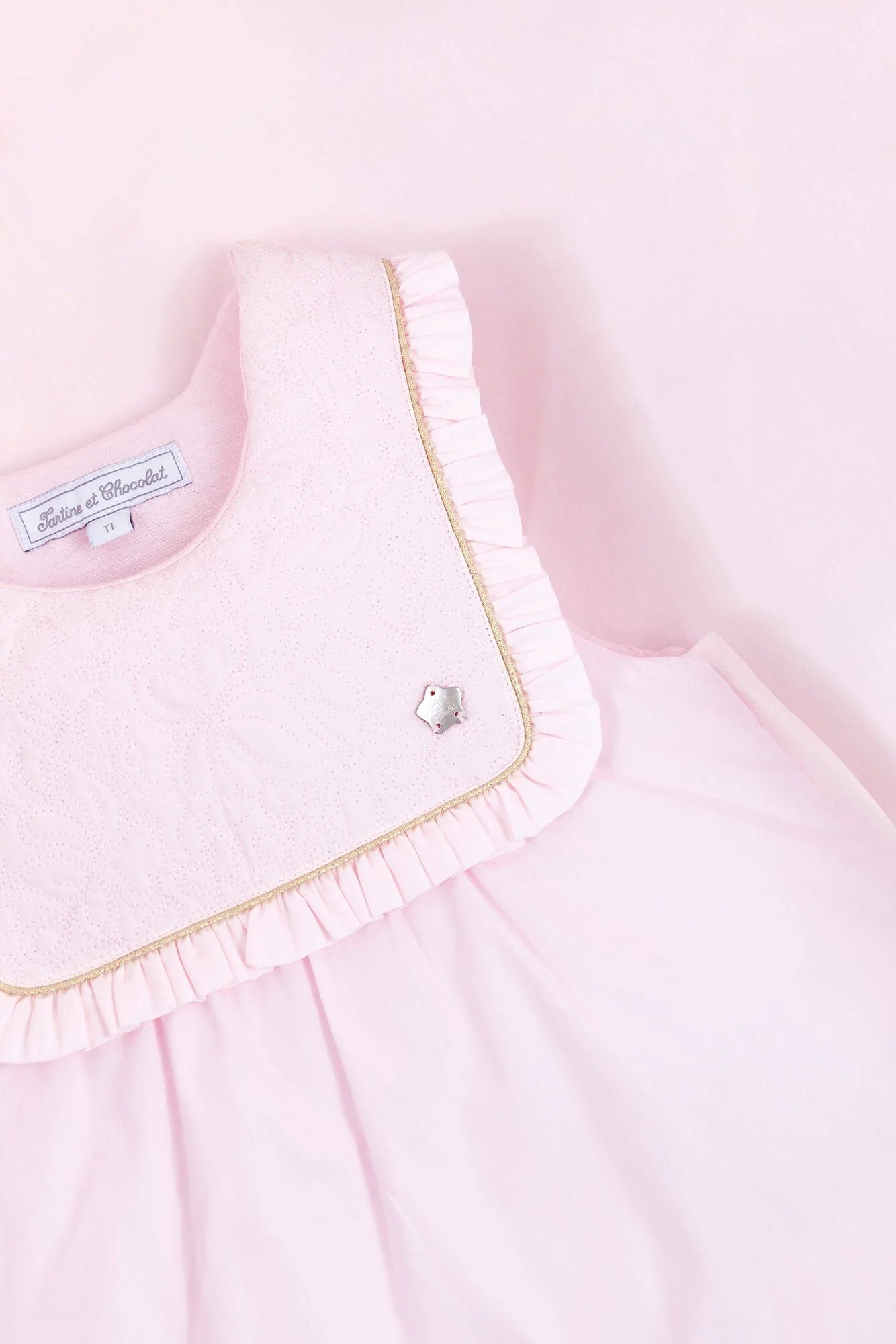 La ligne Délicatesse : Le raffinement et l’élégance de cette ligne illuminent l’univers féérique de la petite fille. Plastron en percale brodée, fils d’or et signature nacrée réhaussent avec modernité les lignes épurées de cette collection.