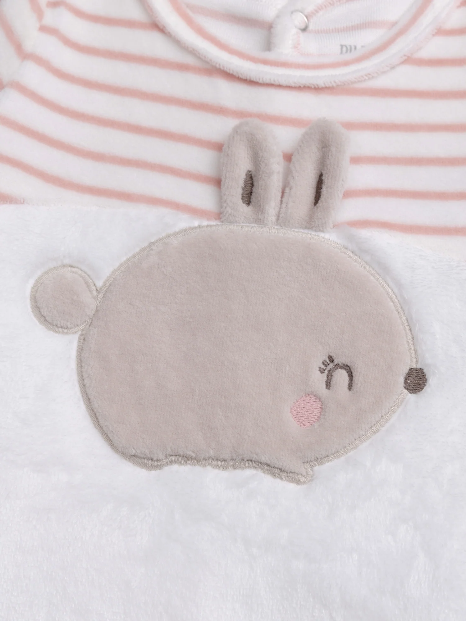 En velours Motif lapin rebrodé Rayures bicolores Ouverture dos par bouton-pression Oreilles en volume Vous pouvez accéder à la fiche produit relative des qualités et caractéristiques environnementales en cliquant ICI.