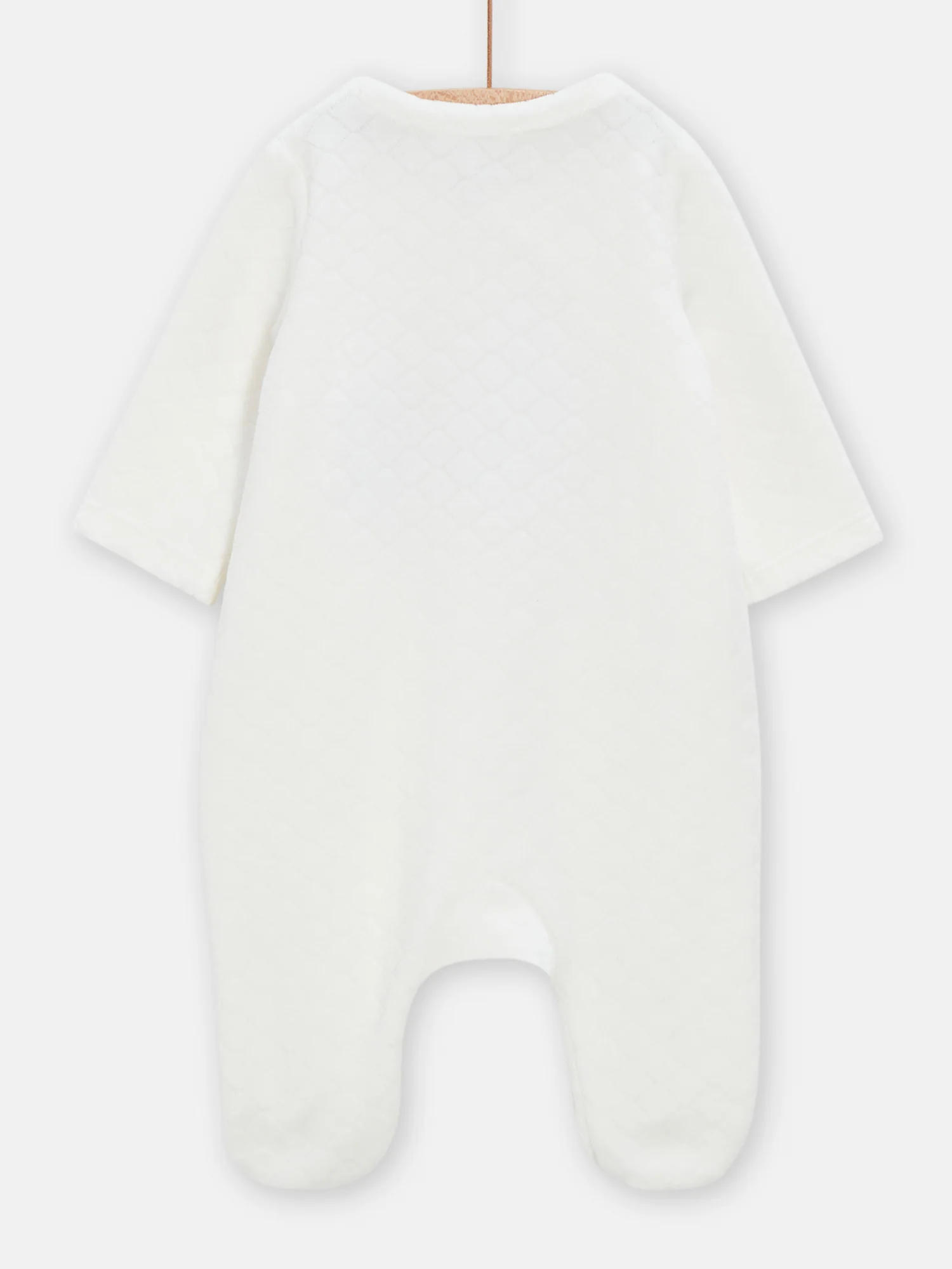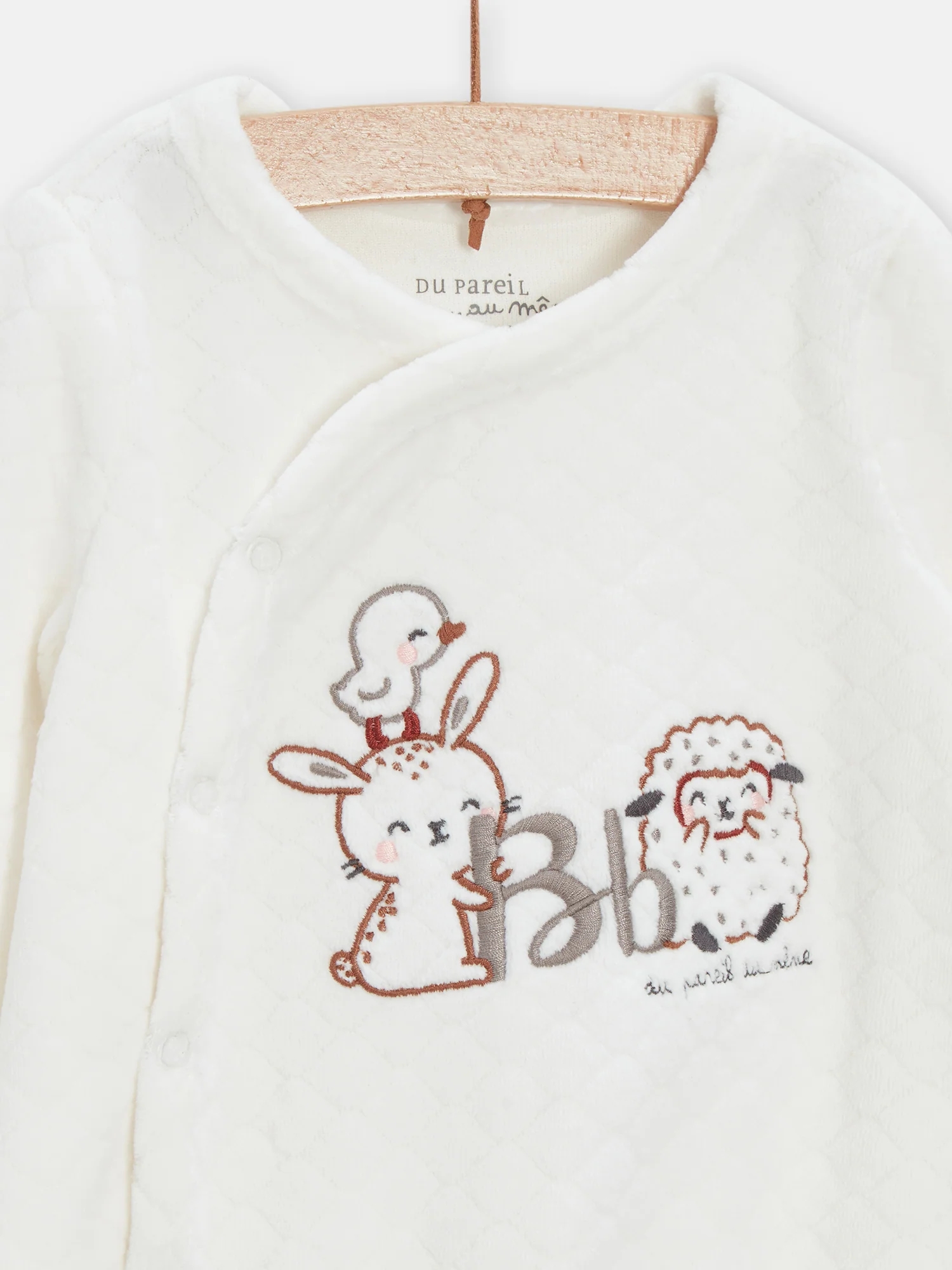 Cette grenouillère naissance écrue en velours fantaisie est parfaite pour votre nouveau-né, offrant chaleur et confort. Avec ses adorables animaux brodés sur le devant et les broderies sous les pieds, elle ajoute une touche de douceur à son look.