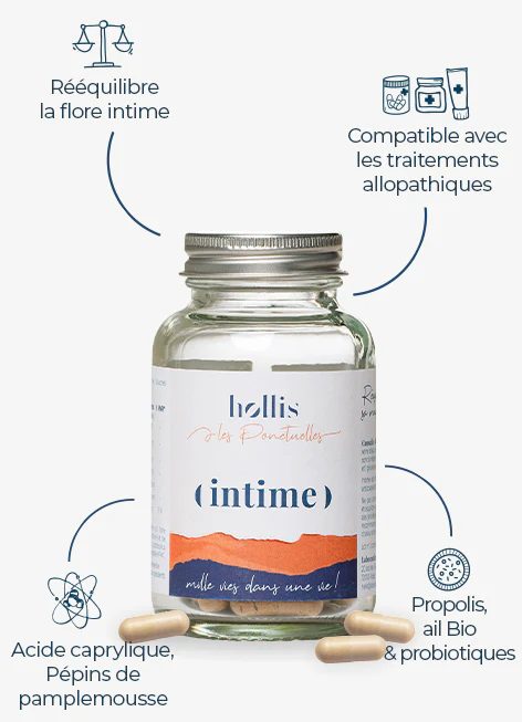 60 gélules – 1 à 2 mois de cure par flacon Synergie de propolis, d’acide caprylique, d’ail et d’Extrait de Pépins de Pamplemousse (EPP) Deux souches de Lactobacilles Utilisable en aigu et en prévention Accompagné du livret PDF de 20 pages de conseils « Mon intimité et moi »