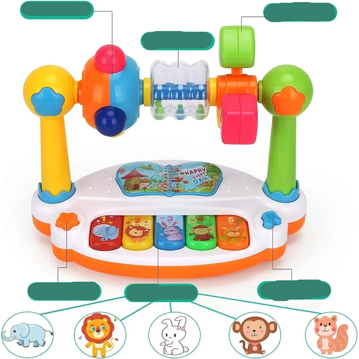 - Rotation Ludique : Ce piano rotatif ajoute une dimension interactive supplémentaire, captivant l’attention des tout-petits tout en améliorant leur coordination.