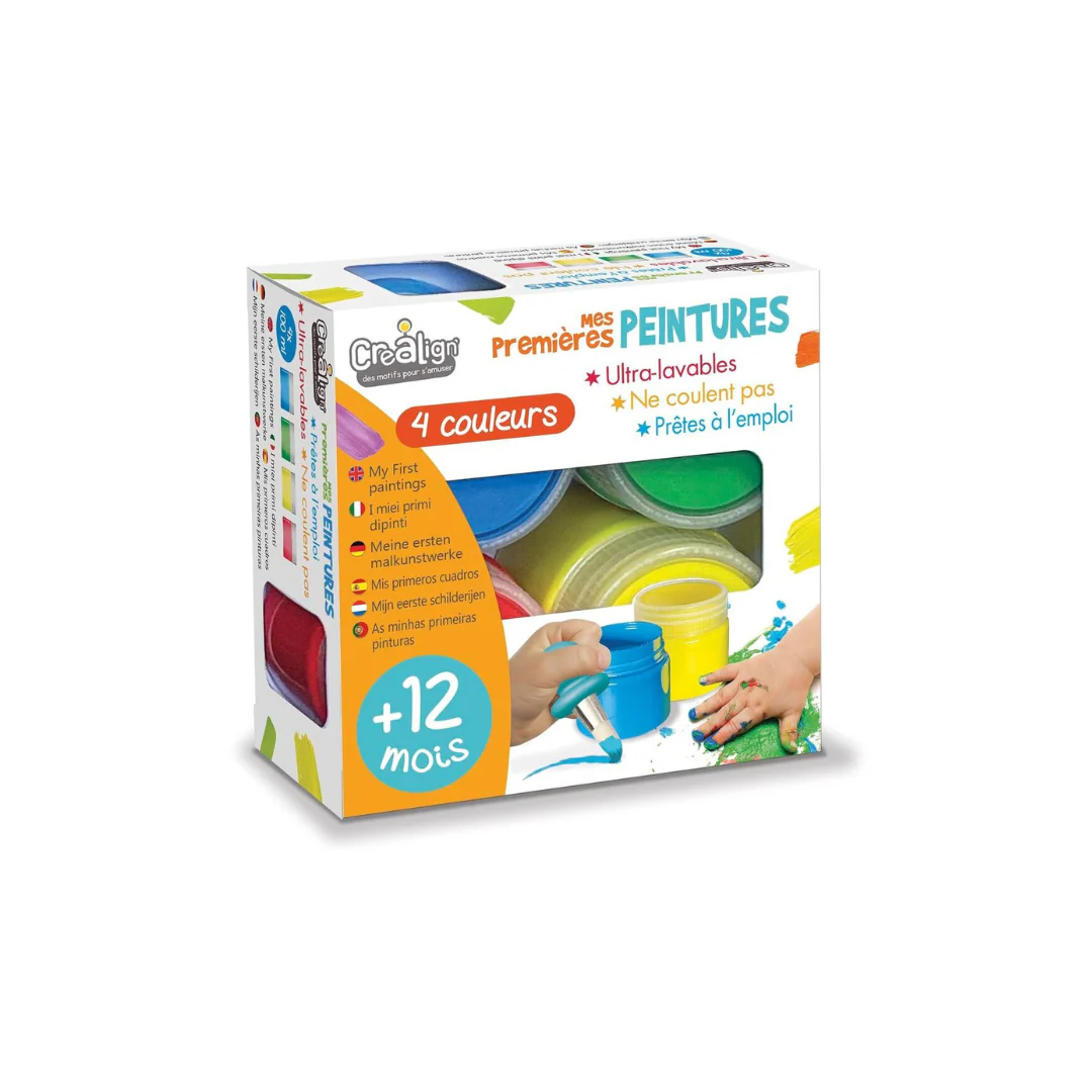 Grâce à ce coffret vos petits bouts pourront laisser libre cours à leur imagination ! Ils exprimeront leur créativité en trempant leurs doigts dans la peinture ou bien en utilisant le coffret « Mes Premiers Pinceaux » . La peinture se lave facilement à l’eau savonneuse. Elles sont prêtes à l’emploi et ne coulent pas.