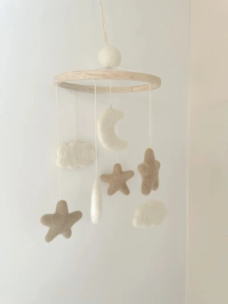 Ce mobile étoiles lune et nuages n laine feutrée décoratif au style épuré et minimaliste, sera parfait pour décorer la chambre de votre bébé.