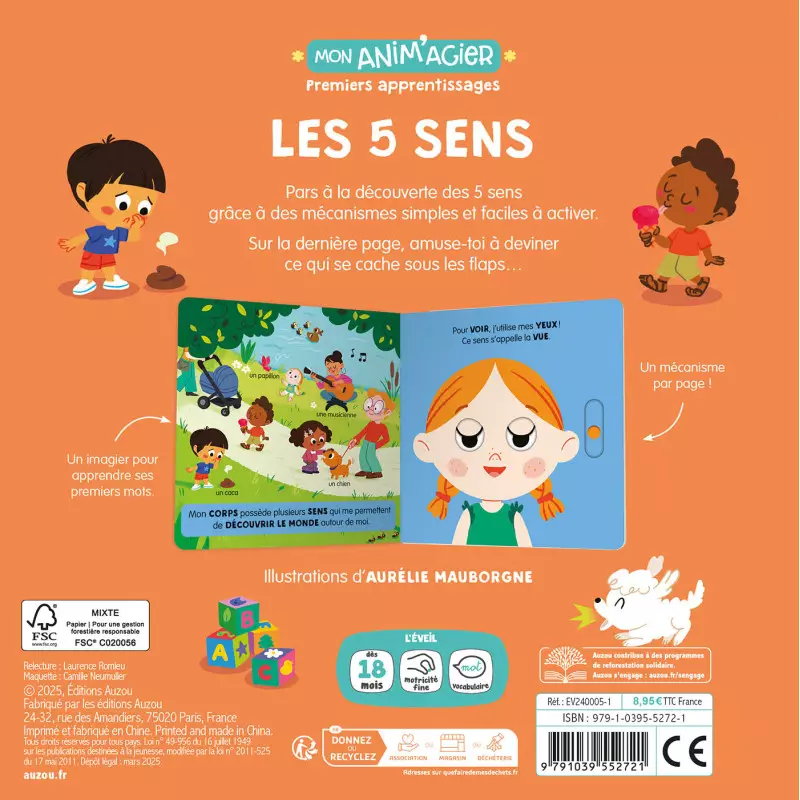 Un livre imagier animé pour découvrir les 5 sens à travers 5 mécanismes solides, logiques et adaptés aux petites mains, faciles à manipuler, et une double page à la fin qui récapitule les apprentissages de façon ludique, grâce à un jeu avec des petites fenêtres à soulever afin de deviner ce qui se cache dessous.