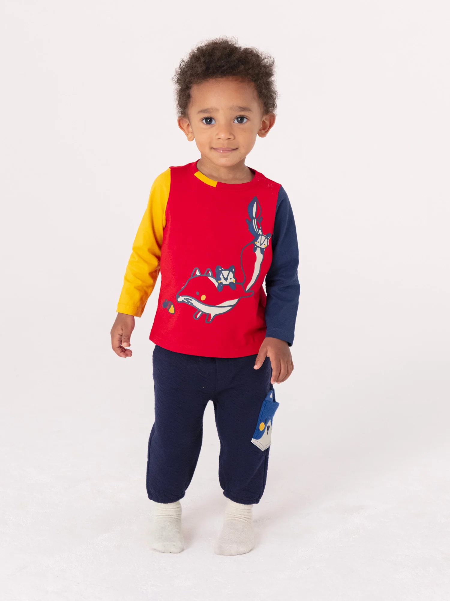 Ce pantalon bleu minuit en molleton est parfait pour garder votre petit garçon confortable et élégant. Fabriqué en molleton de coton doux, il offre une sensation de chaleur et de douceur. La taille élastiquée assure un ajustement confortable et sécurisé, tandis que les deux poches à l’avant offrent un espace pratique pour ranger de petits objets. De plus, une poche cargo animée avec la tête de renard ajoute une touche ludique et amusante à ce pantalon, qui plaira à votre enfant tout en ajoutant une touche de style à ses tenues.