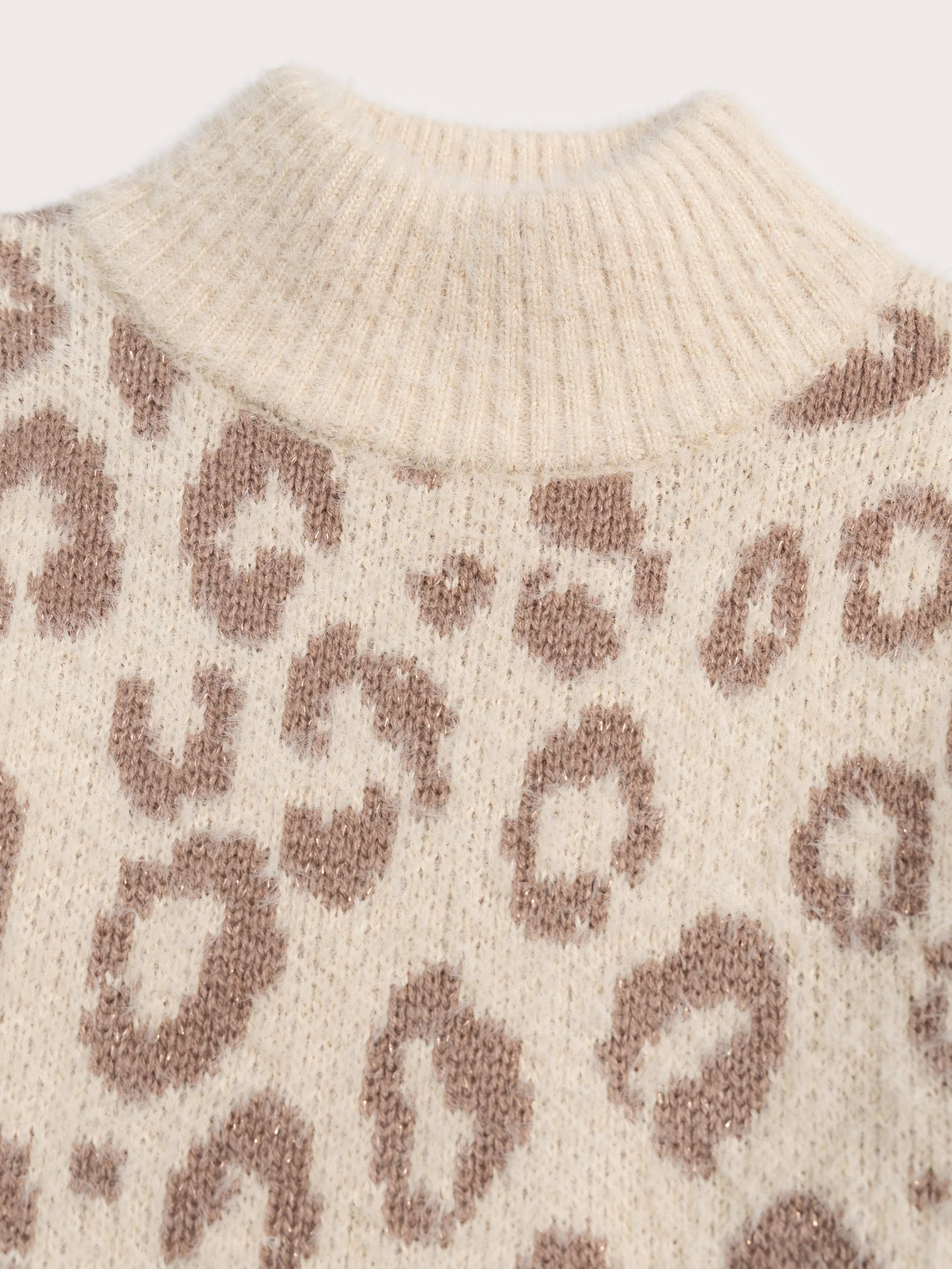 Ce pull tricoté en jacquard à motif léopard est conçu pour les enfants, idéal pour la saison fraîche. Il est en polyester avec un col montant, offrant une texture douce et confortable. Les fils brillants apportent une touche élégante à ce vêtement.