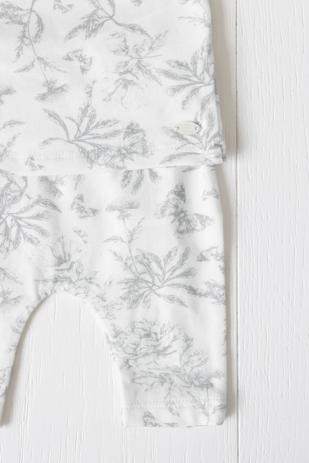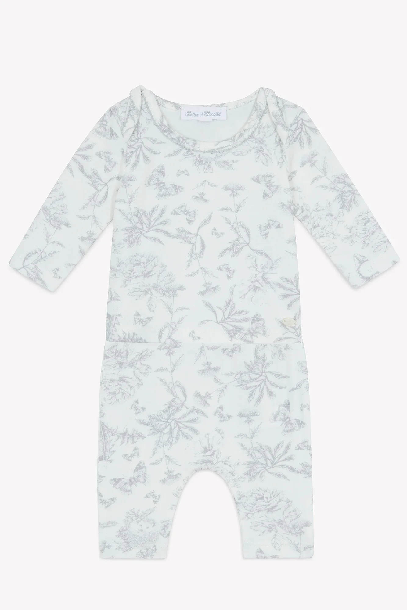 Ce délicat pyjama est orné d’un charmant motif inspiré de la toile de Jouy, dans des tons doux de gris clair. Confectionné dans un tissu doux et confortable, il enveloppera votre bébé de tendresse pendant ses moments de repos. Parfait pour les nuits paisibles et les doux rêves de votre nouveau-né.