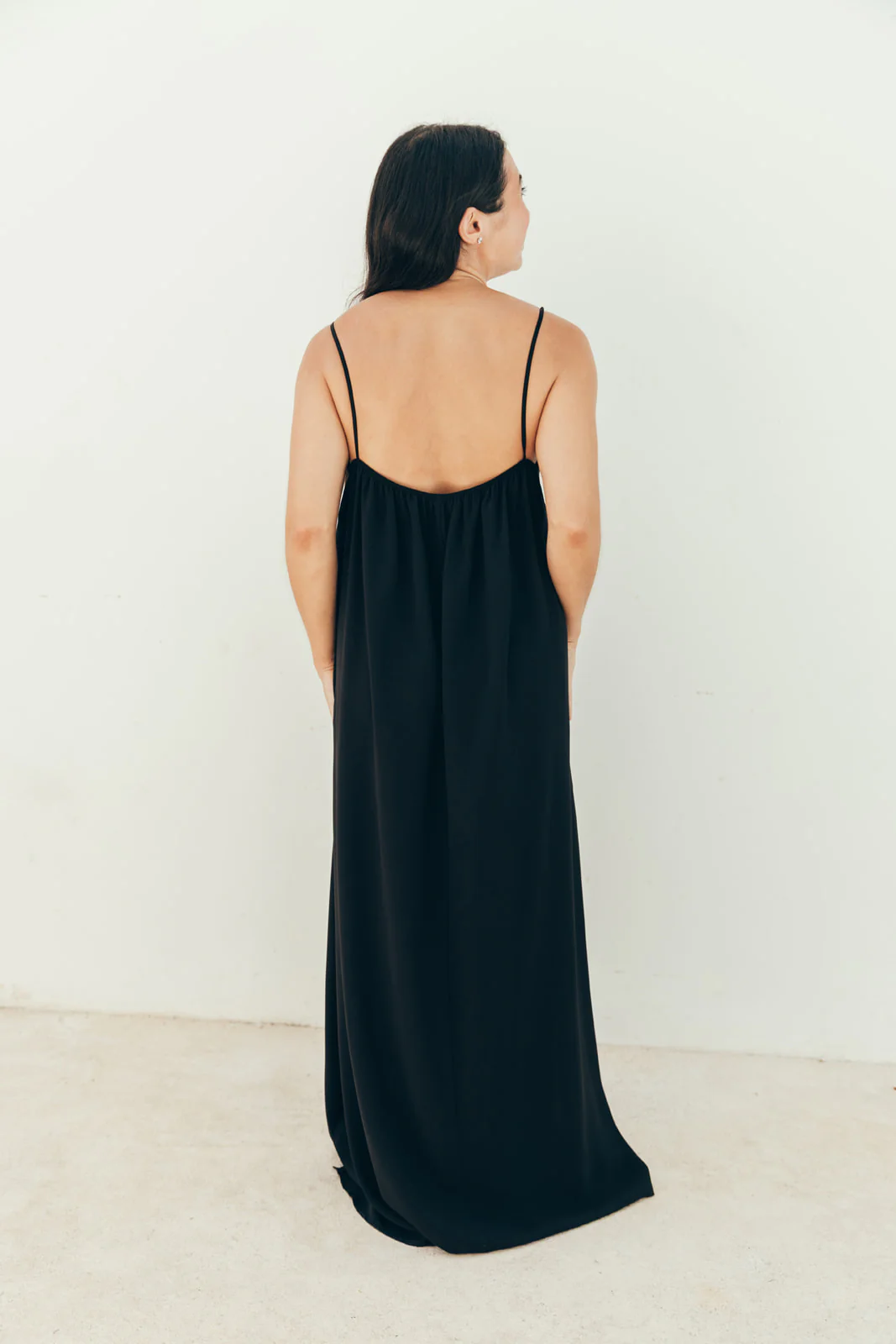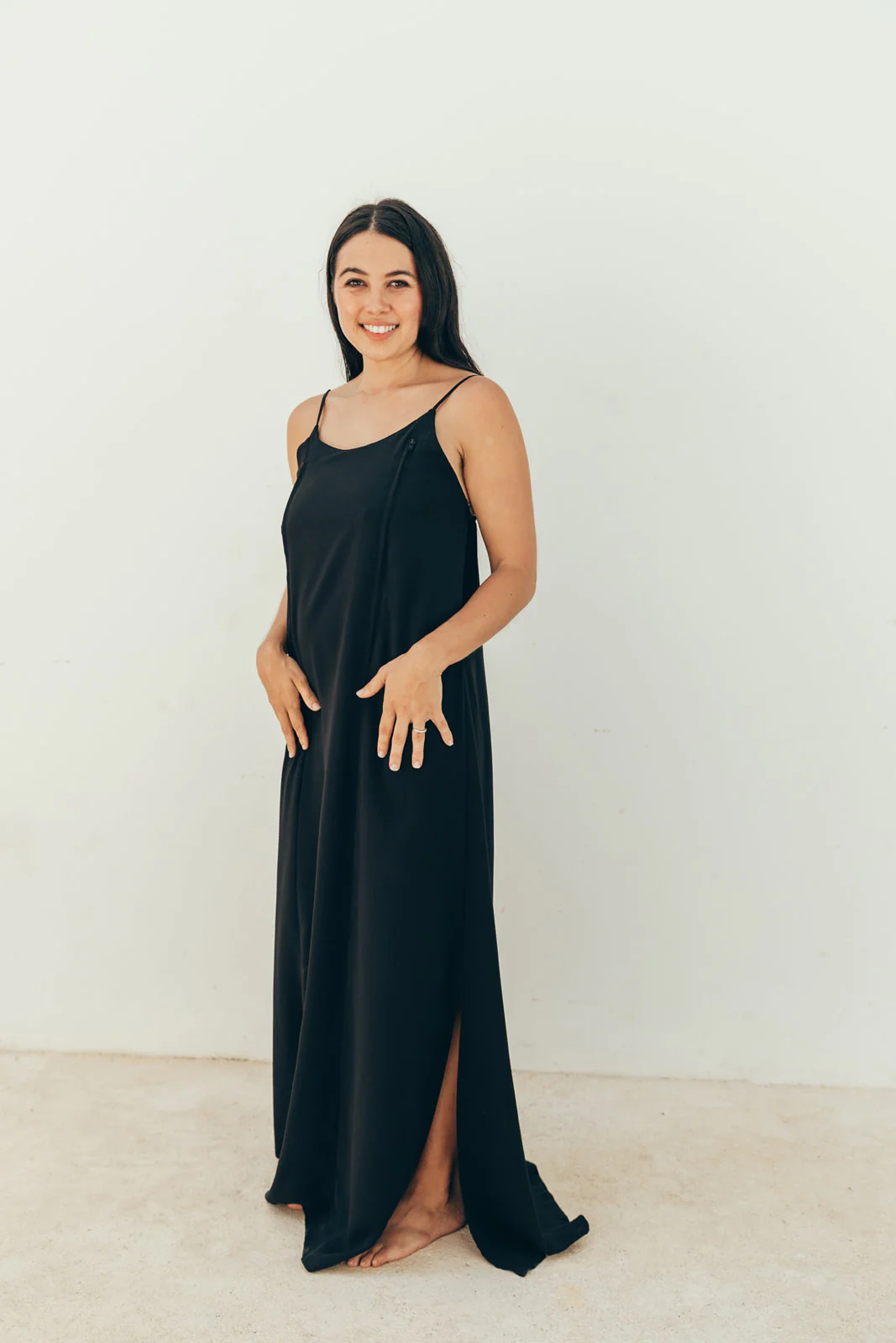 Robe d’allaitement à bretelles avec deux zips d’ouvertures sur le coté. La mannequin mesure 1,56cm et porte une taille S. Expédition sous 48h.