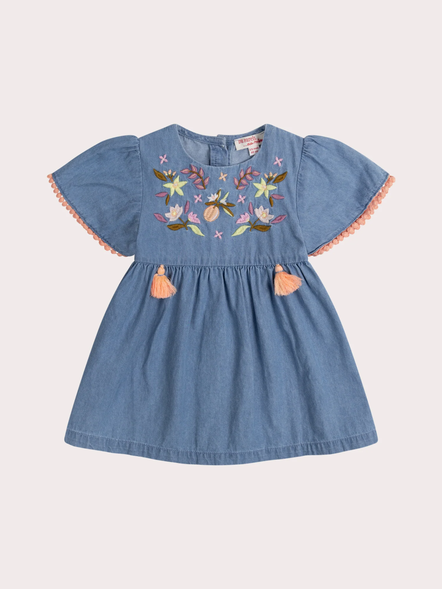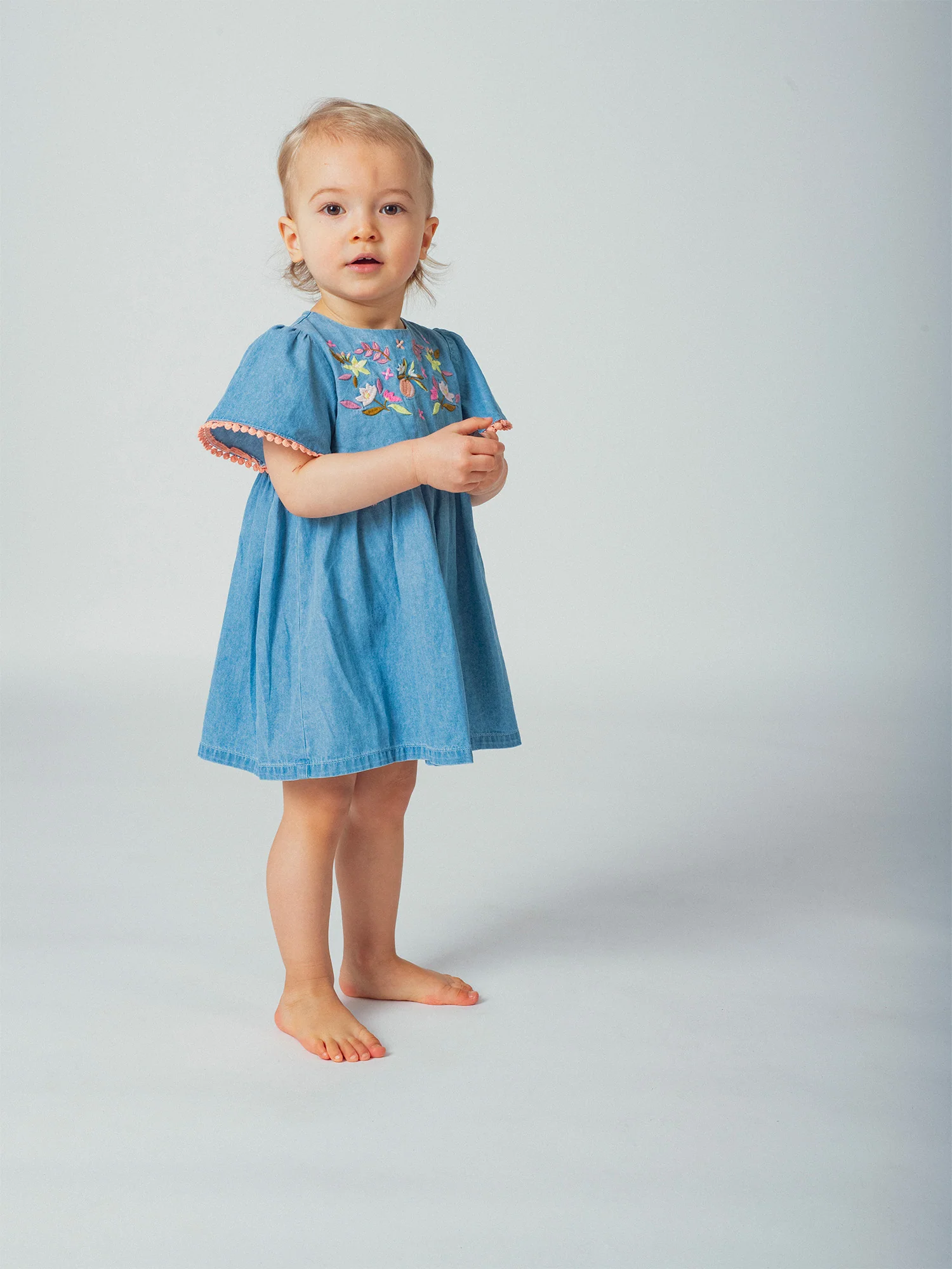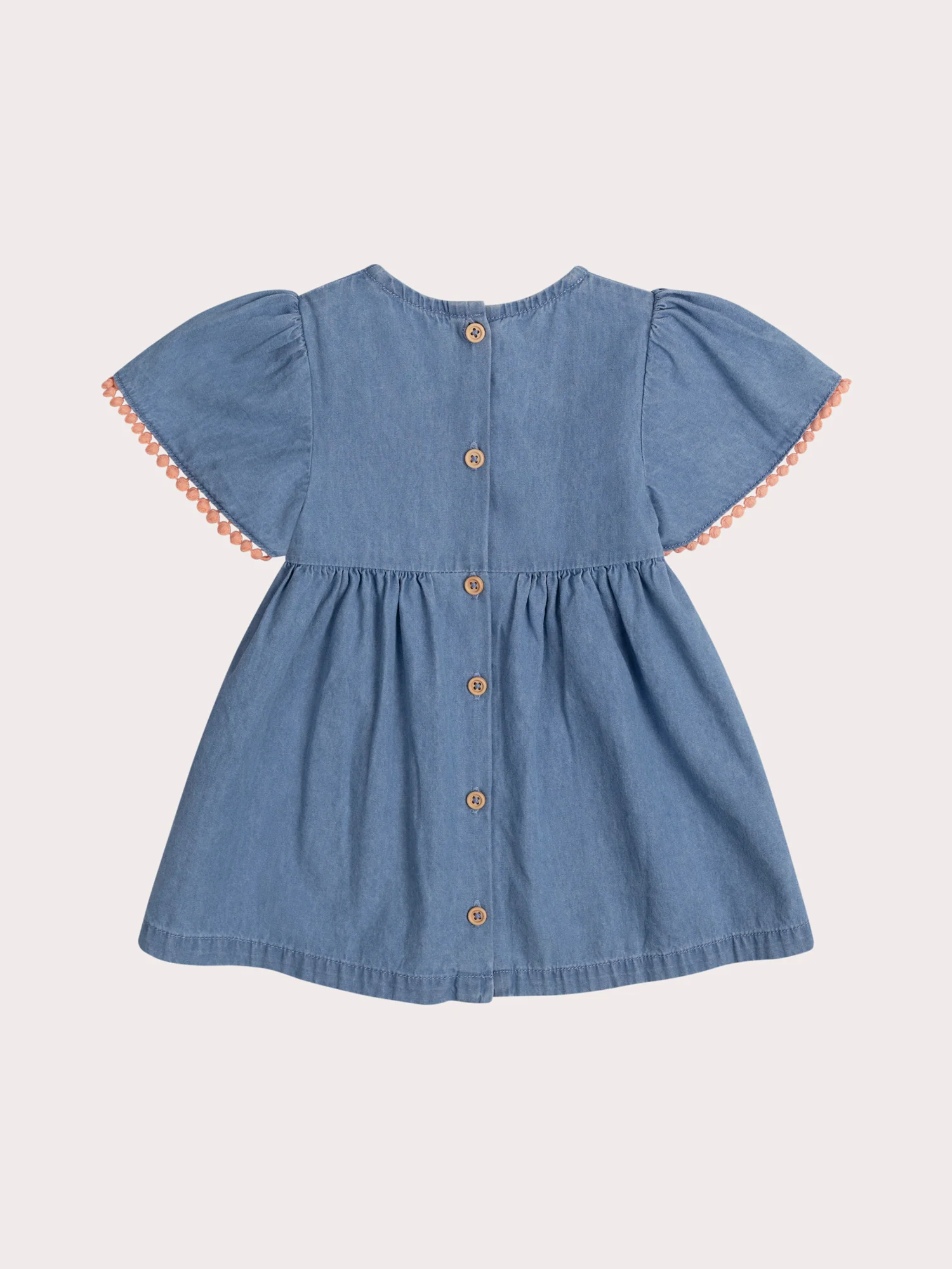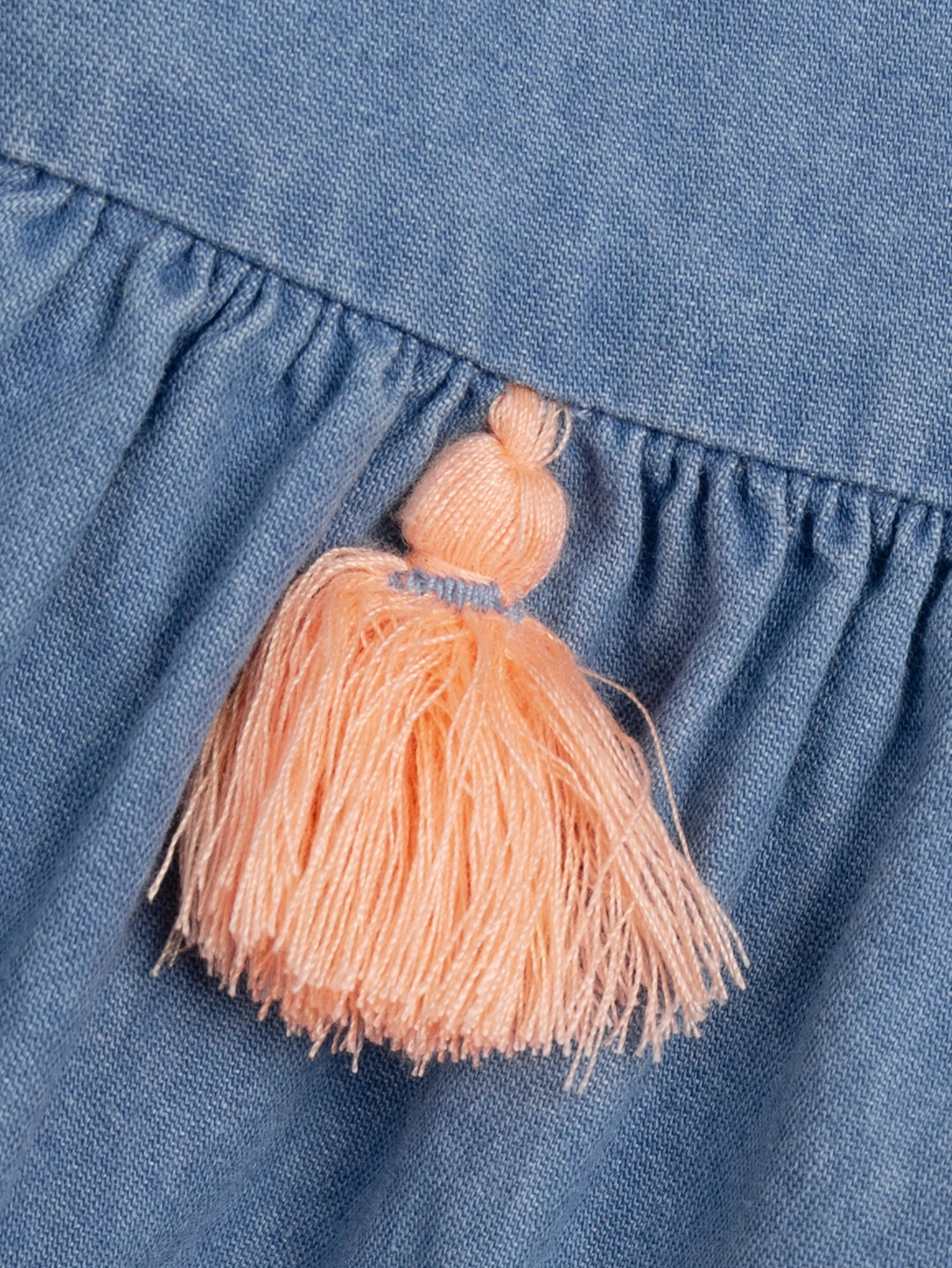 Pour les petites filles stylées, cette robe en denim est idéale pour les journées fraîches. Confectionnée en denim durable, elle dispose d’une ouverture boutonnée au dos et d’un pompon assemblé à la taille pour plus de charme. Les broderies agrumes sur la poitrine et le ruban fantaisie aux extrémités ajoutent une touche colorée et délicate à ce modèle.