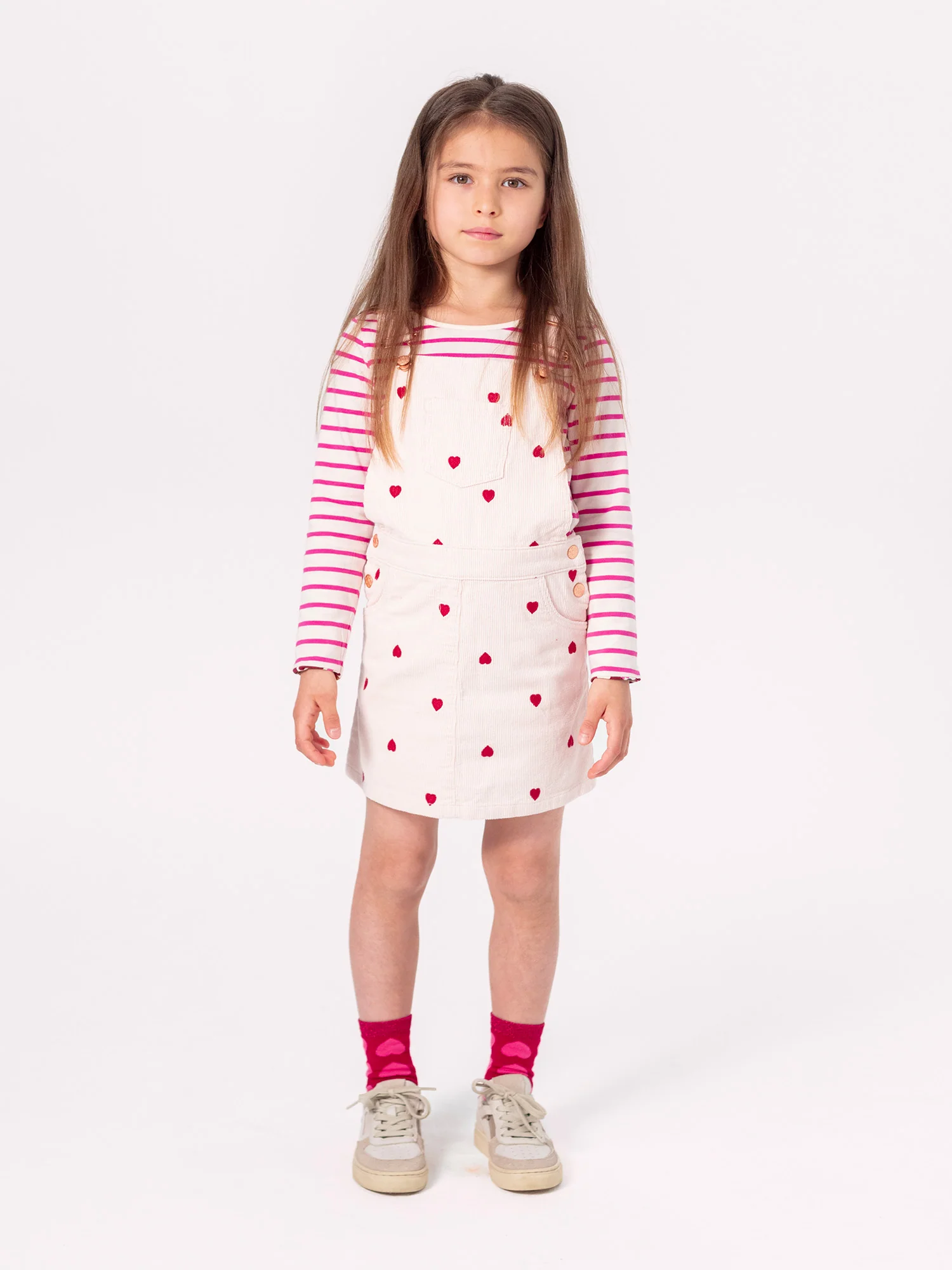 Pour les petites filles pleines de douceur, cette robe écru en velours côté avec des cœurs brodés est parfaite pour les journées d’automne et d’hiver. Fabriquée en coton confortable, elle présente une coupe style salopette, offrant à votre enfant une liberté de mouvement optimale. Avec ses cœurs brodés et ses multiples poches, cette robe ajoutera une touche ludique et pratique à son univers de jeu.