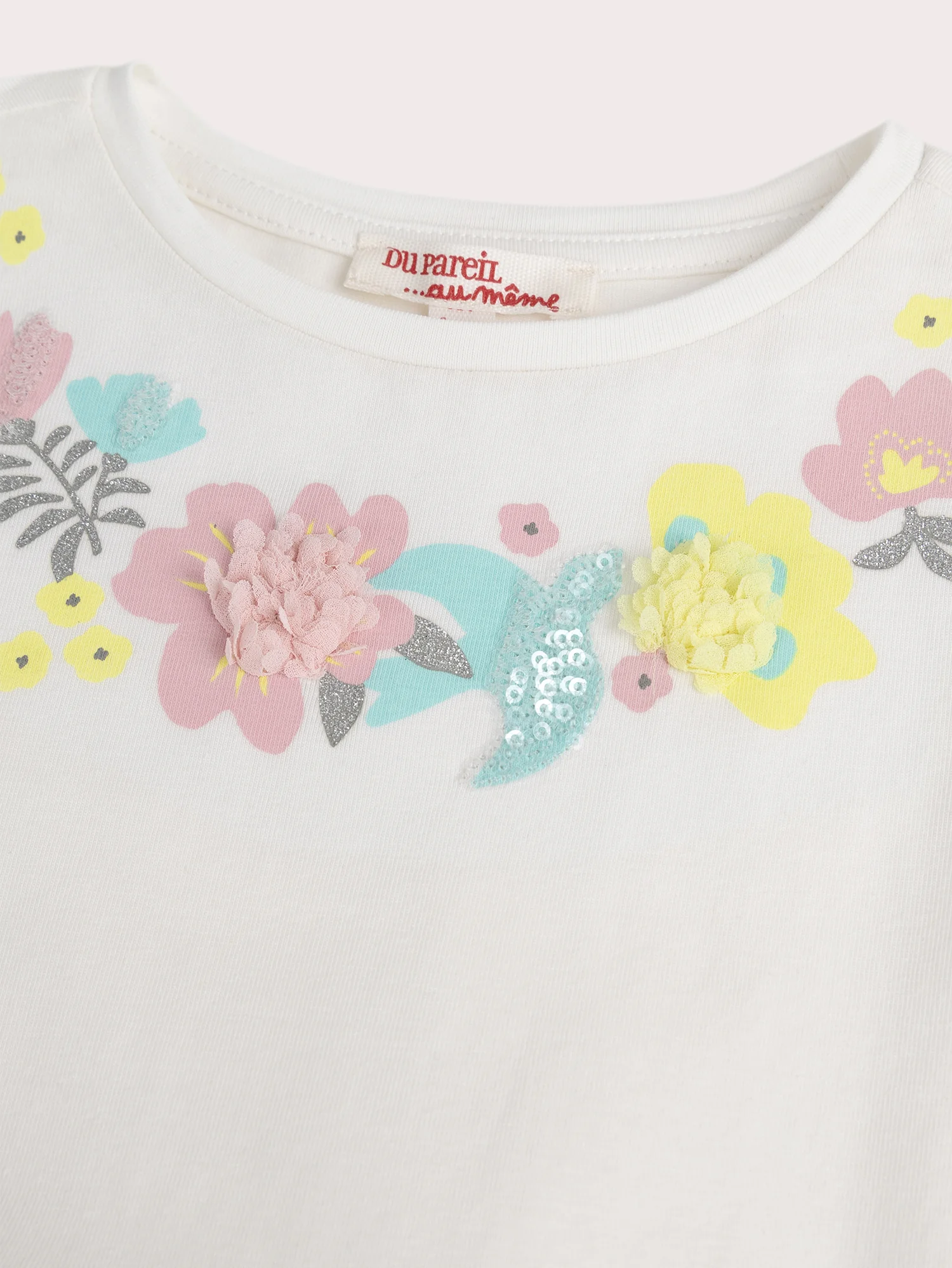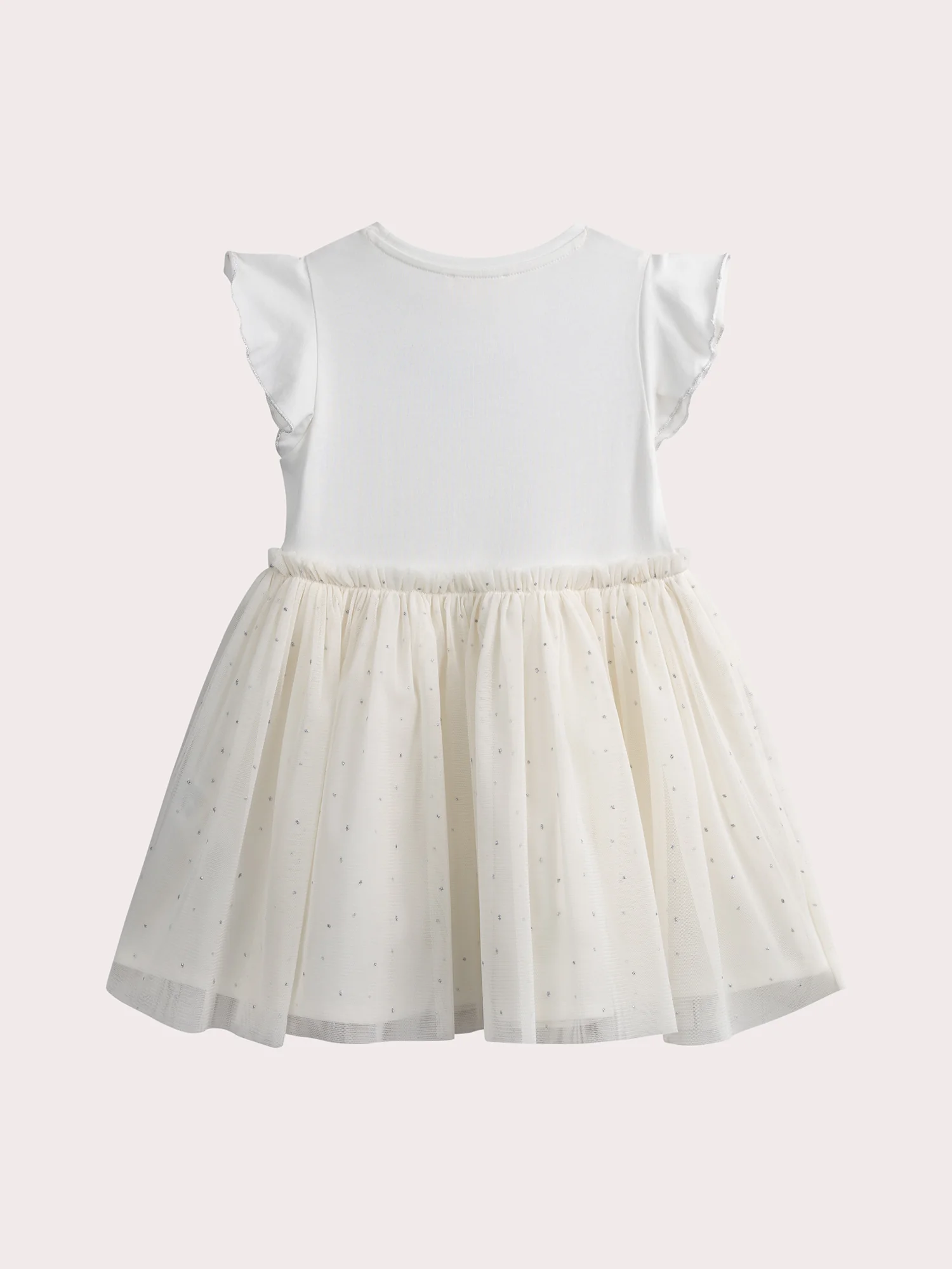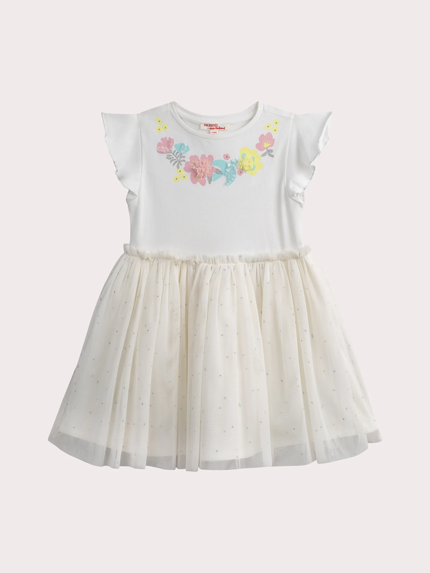 Cette robe écrue bi-matiere, mêlant jersey et tulle, est agrémentée d’un joli collier de fleurs en animation multi-techniques. Les manches volantées apportent une touche de légereté et de féminité. Idéale pour une allure chic et douce, parfaite pour toutes les occasions.