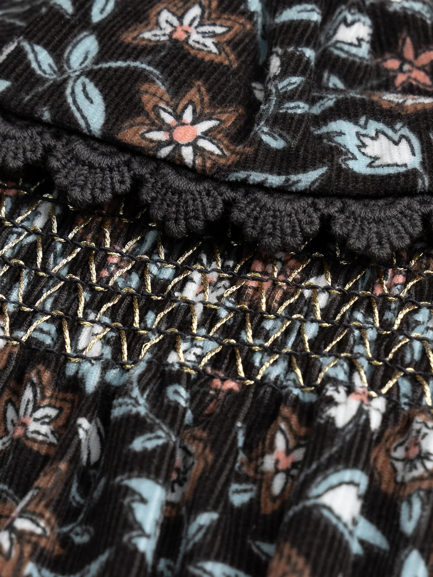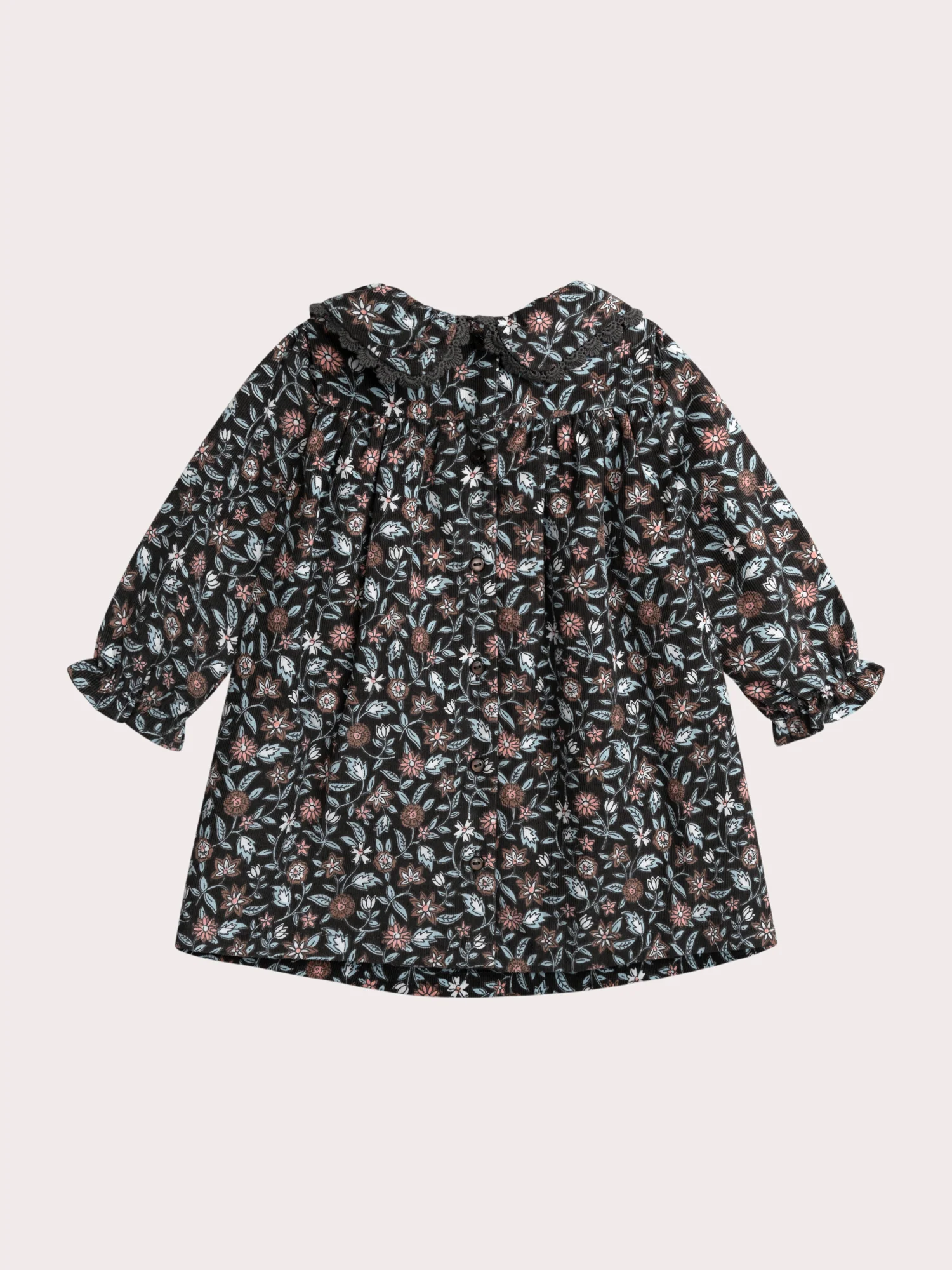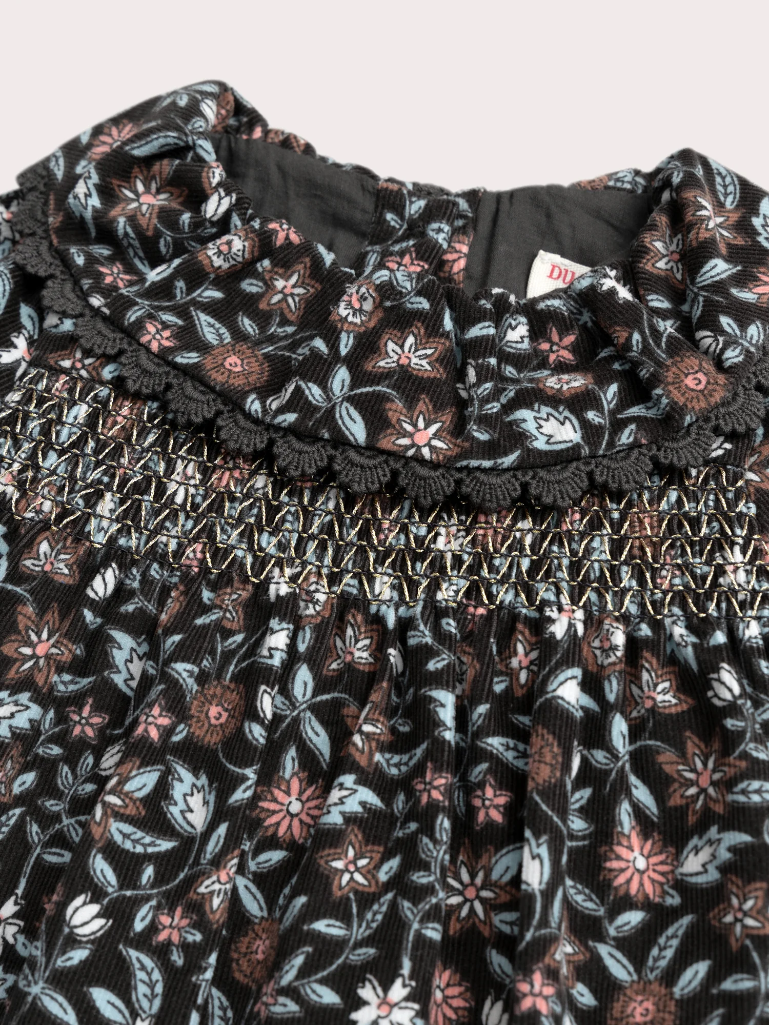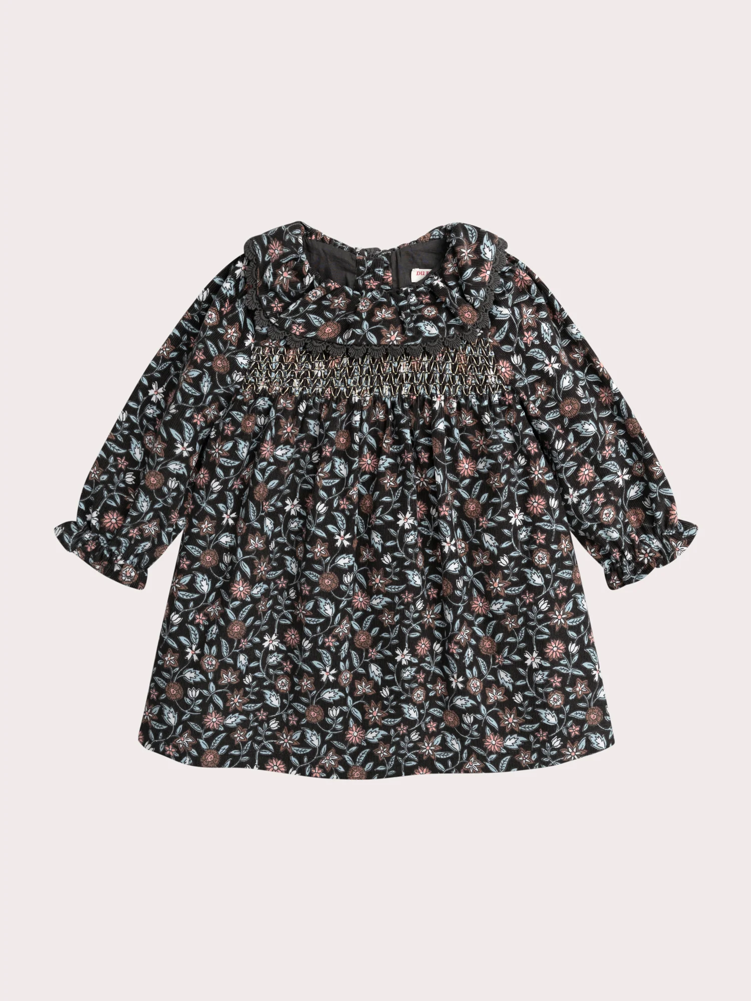 Cette robe fleurie en velours côtelé est idéale pour les bébés filles, parfaite pour les saisons fraîches. Sa matière douce et structurée assure confort et élégance. Le col volant, le smock à la poitrine, les poignets à fronces élastiques et l’ouverture boutonnée au dos apportent charme et délicatesse à ce modèle.