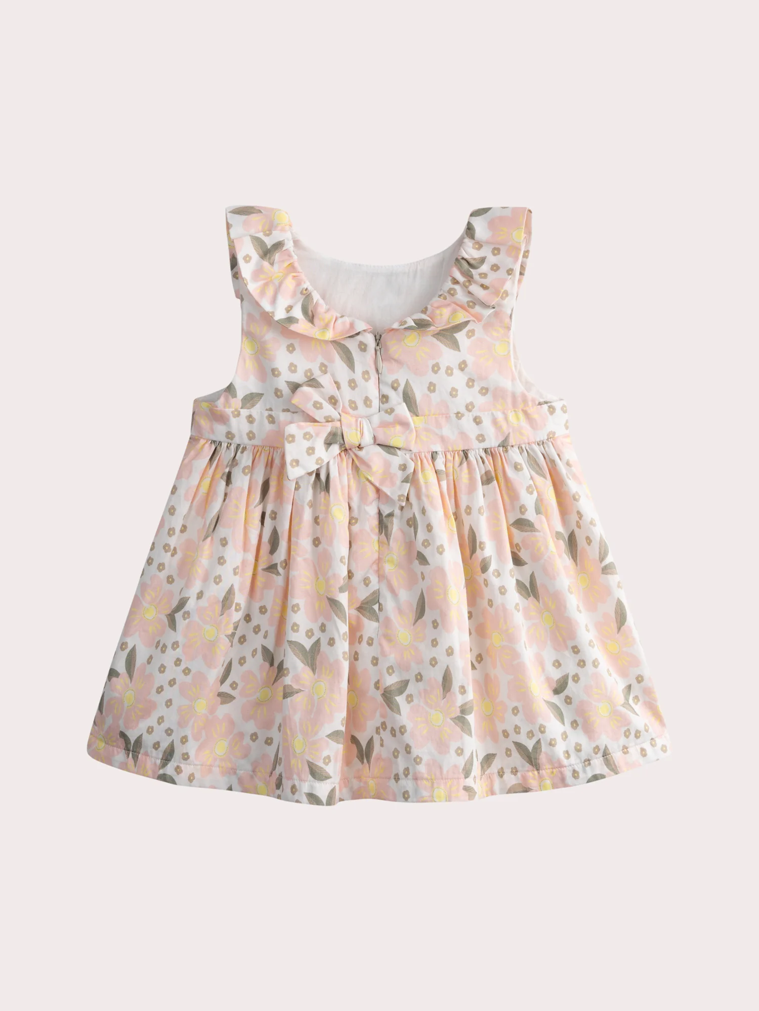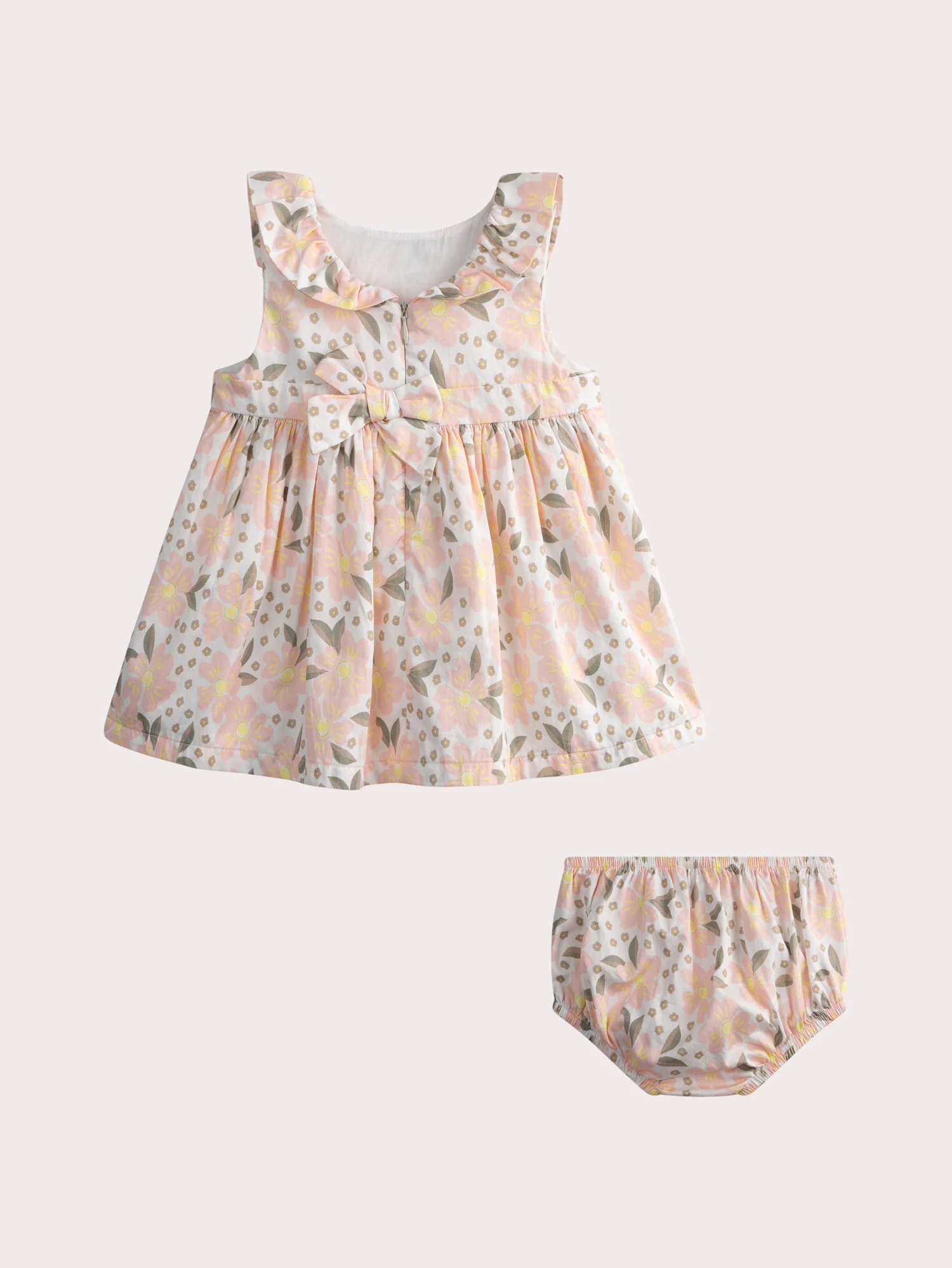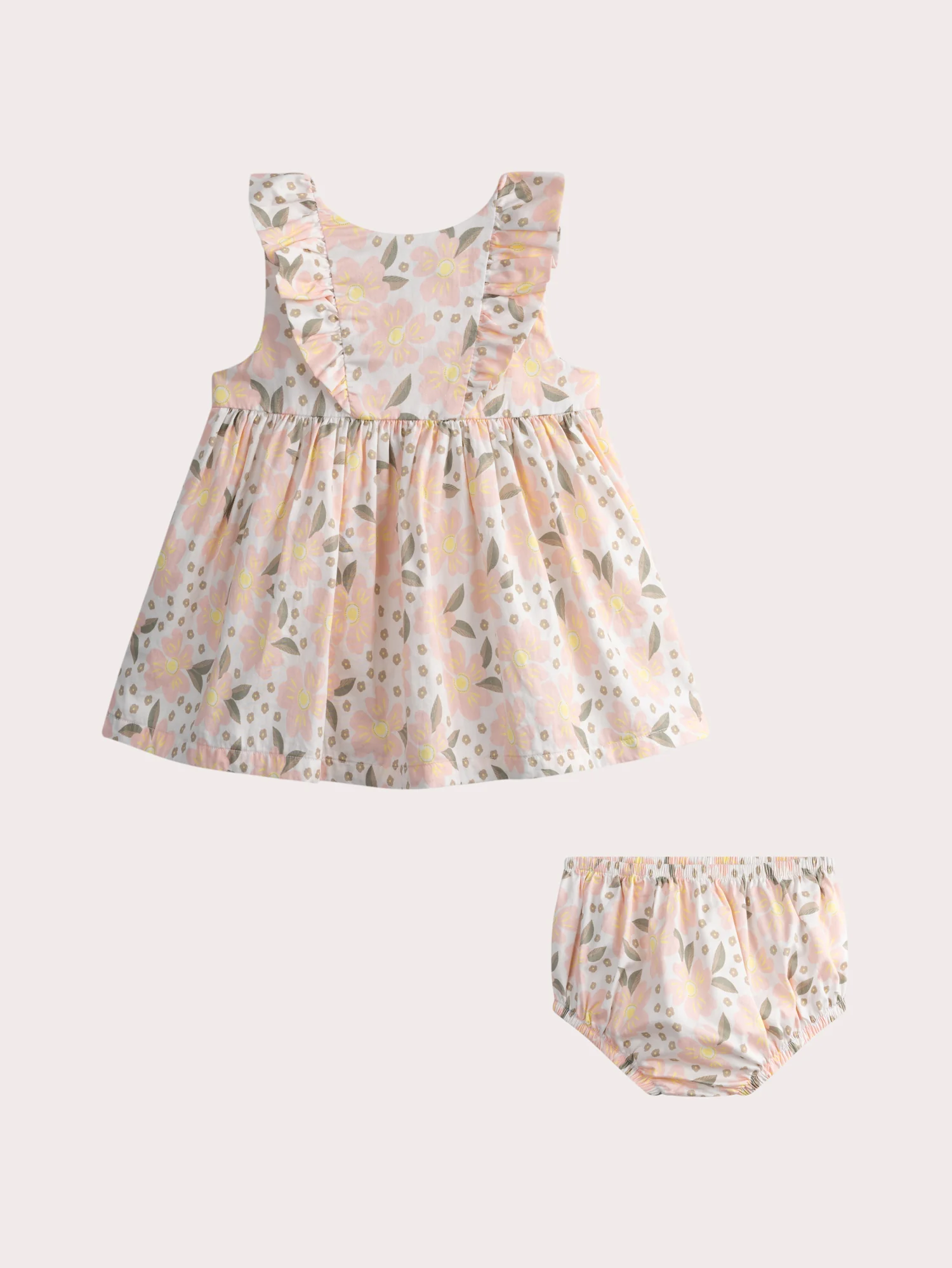 Cette robe fleurie pour bébé fille en satin de coton offre un joli imprimé de fleurs colorées, apportant douceur et élégance. Elle est accompagnée d’un bloomer assorti pour un ensemble harmonieux. La taille est ajustable grâce à un ruban noué au dos, et la fermeture invisible assure une finition soignée.