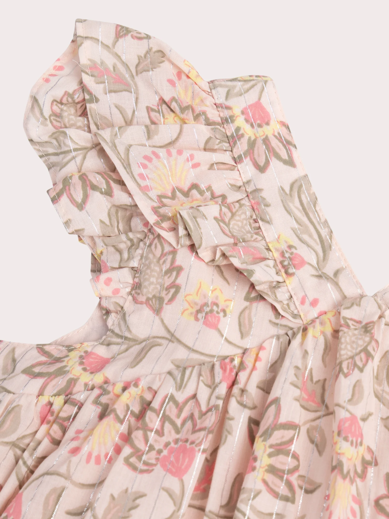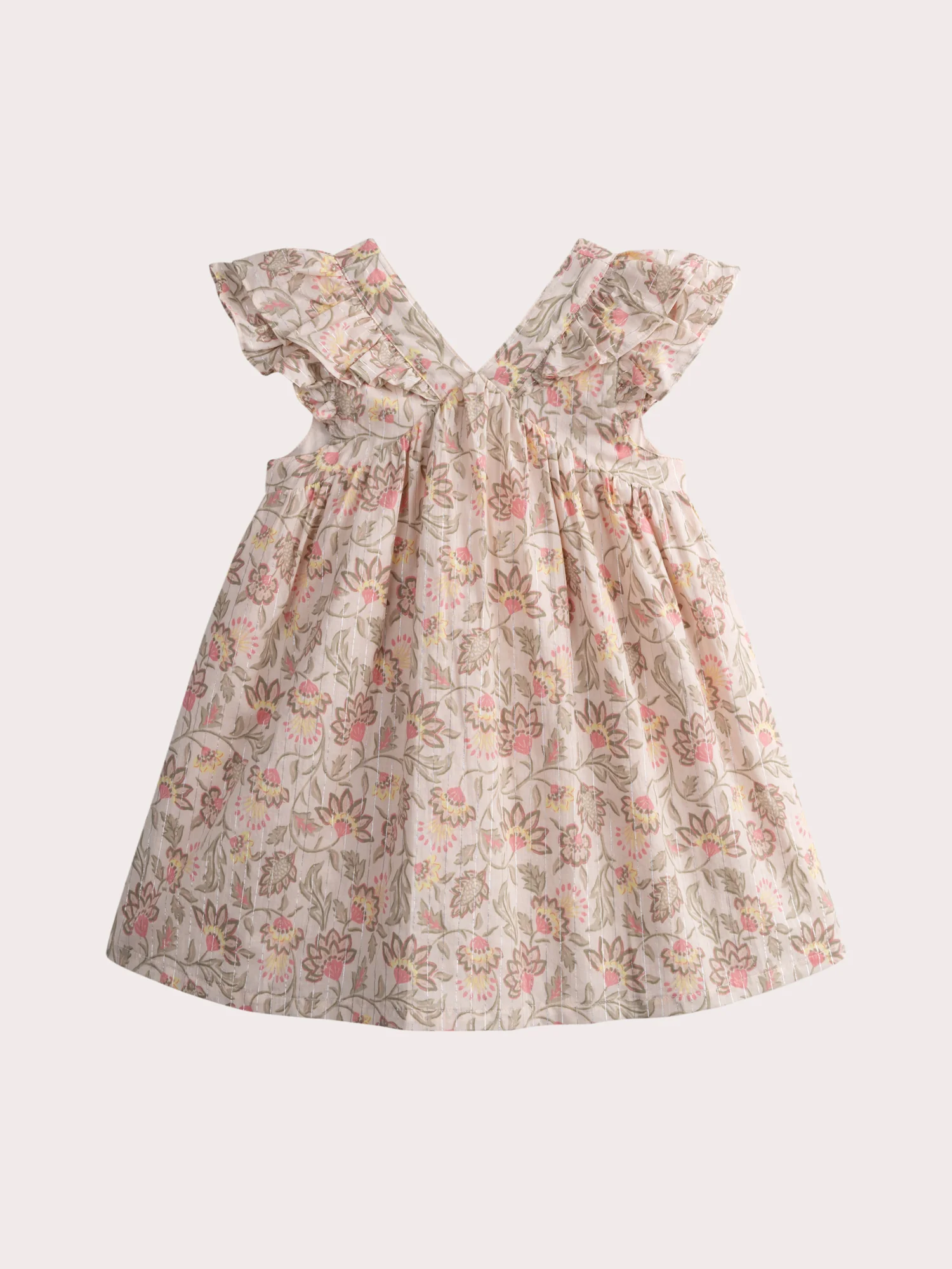 Cette robe fluide en voile de coton, ornée de fines rayures métalliques, offre un look à la fois élégant et léger. Le dos en V et les manches volantées ajoutent une touche de raffinement et de mouvement. Idéale pour les journées ensoleillées, elle allie confort et style avec ses détails délicats.