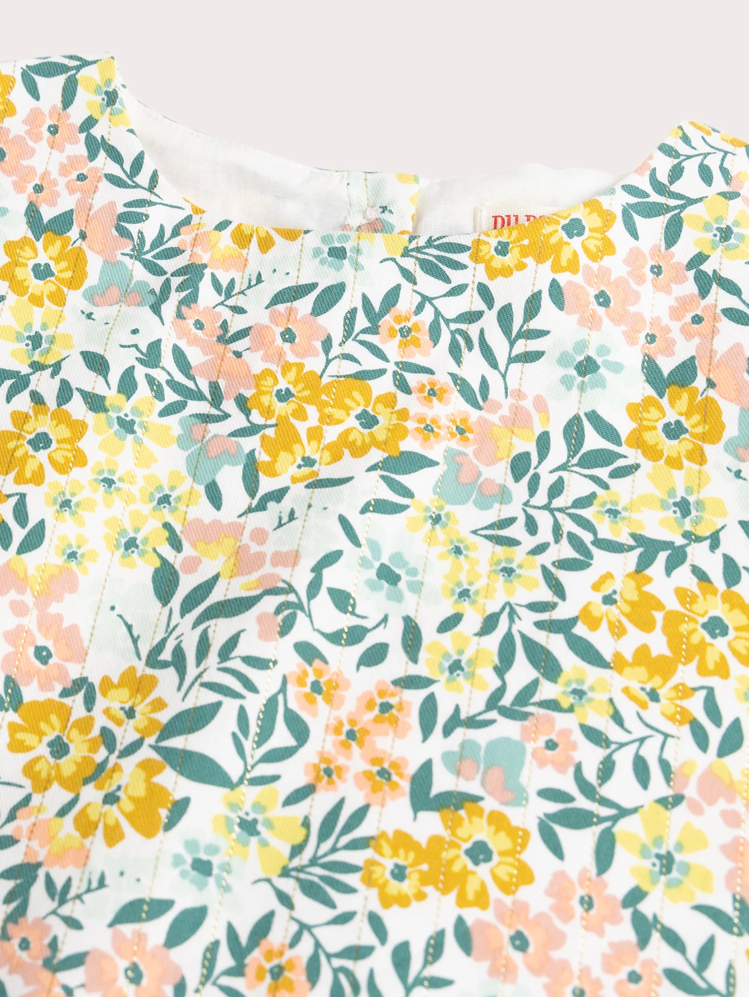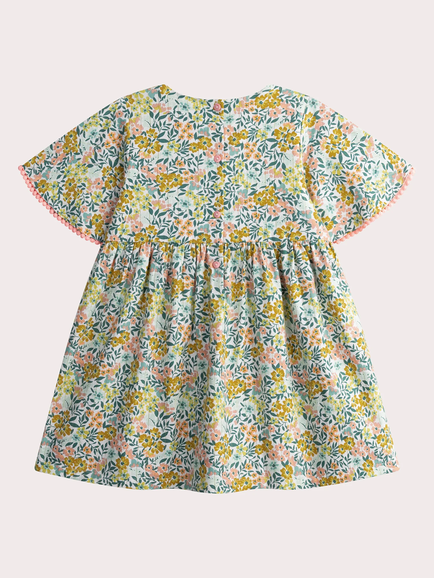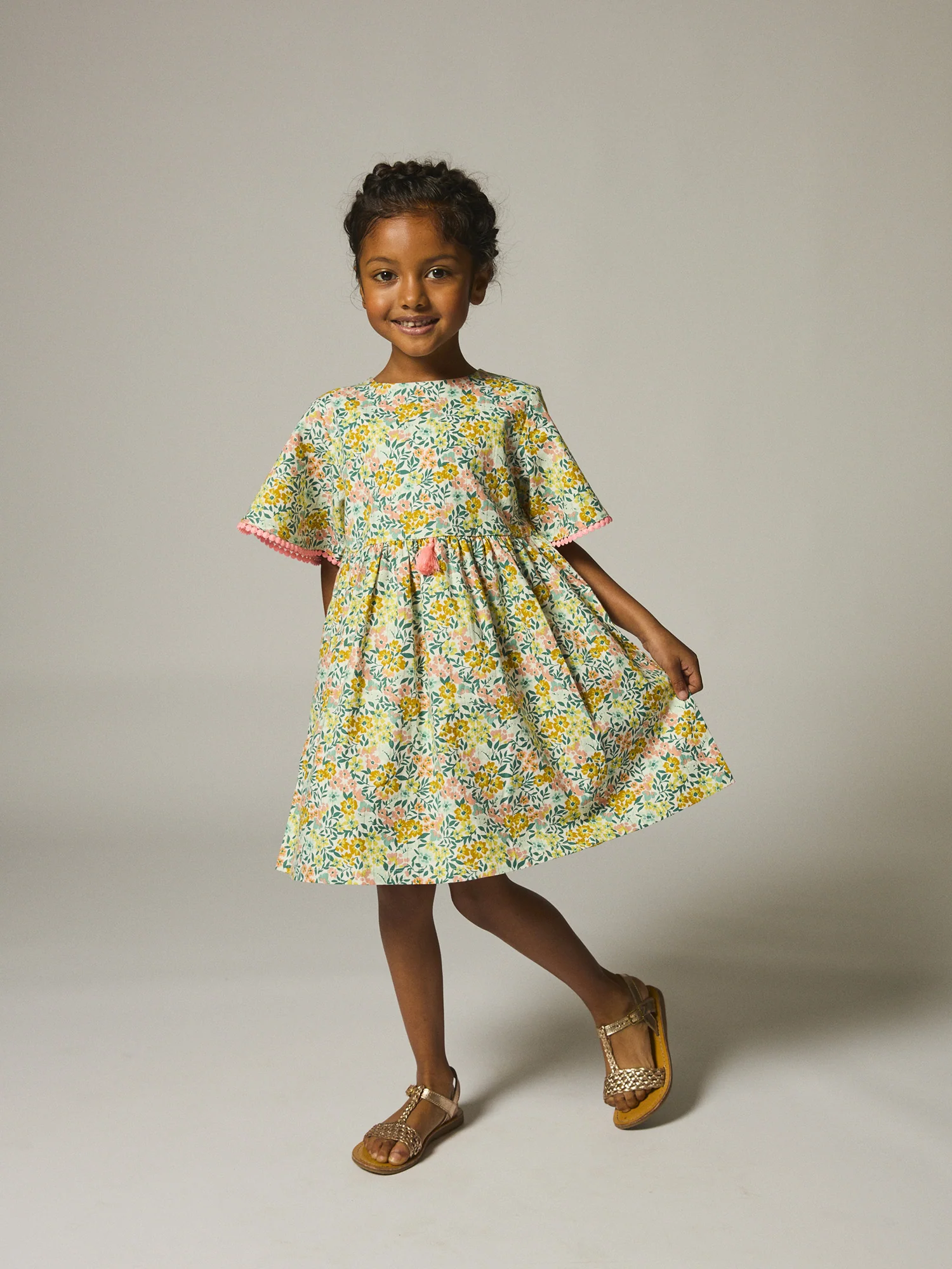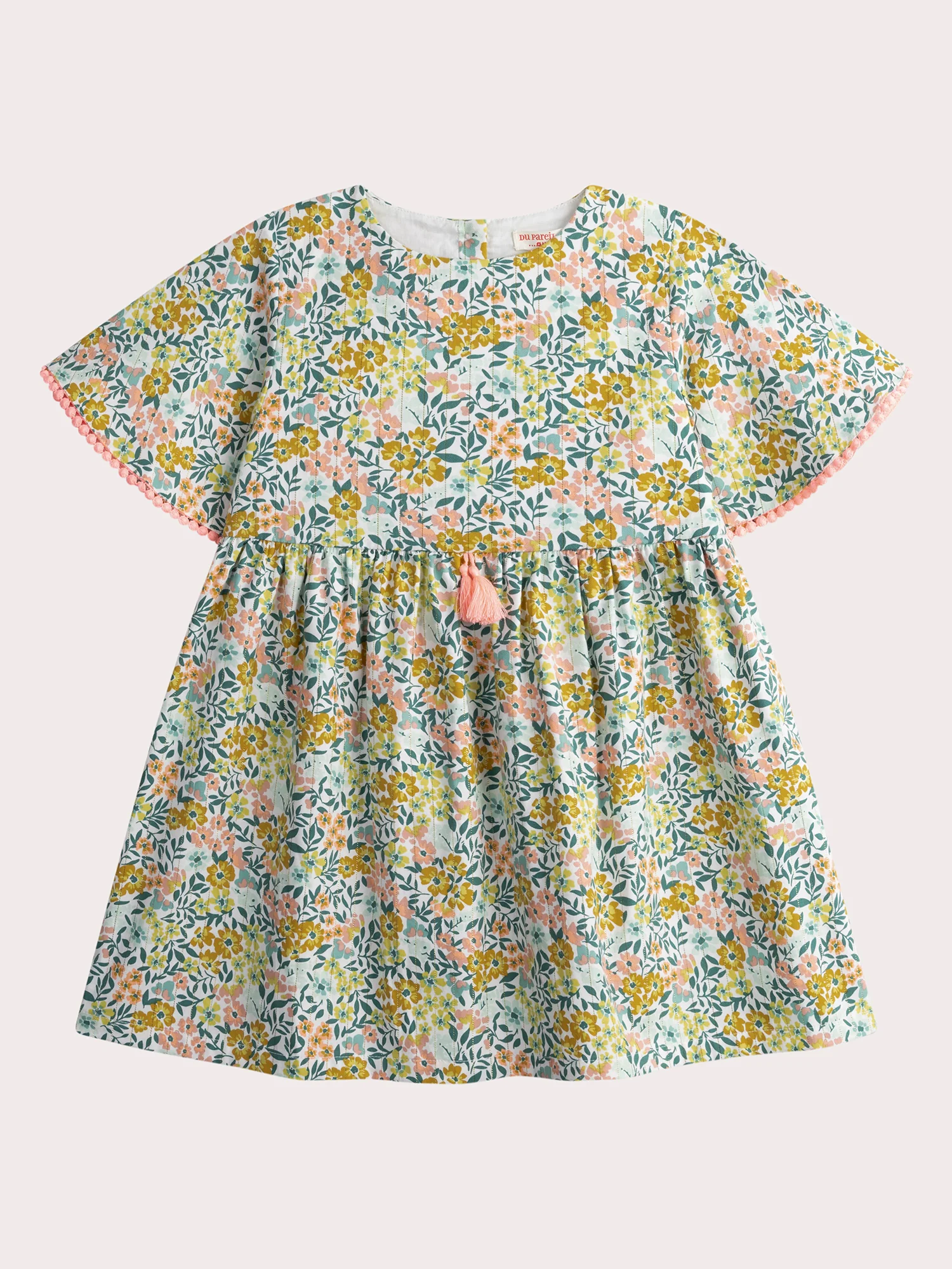 Cette robe à imprimé floral est idéale pour les journées ensoleillées, apportant une touche de fraîcheur et de gaieté. Confectionnée en toile légere, elle dispose de manches courtes avec des finitions en bande de pompons pour plus de charme. L’imprimé fleuri et les pompons sur le devant ajoutent une note joyeuse et colorée à la tenue.