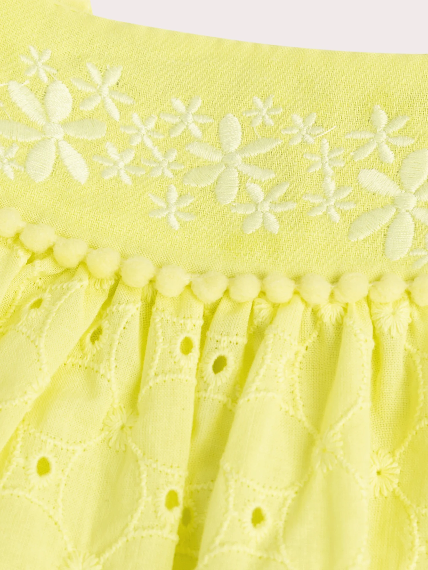Cette robe jaune pastel pour bébé fille, ornée de broderie anglaise, offre une touche douce et raffinée. L’empiècement devant est délicatement brodé de fleurs, tandis que les épaules sont élégamment recouvertes de bretelles à volants avec des pompons aux bords. L’ouverture au dos permet de l’enfiler facilement tout en assurant un confort optimal.