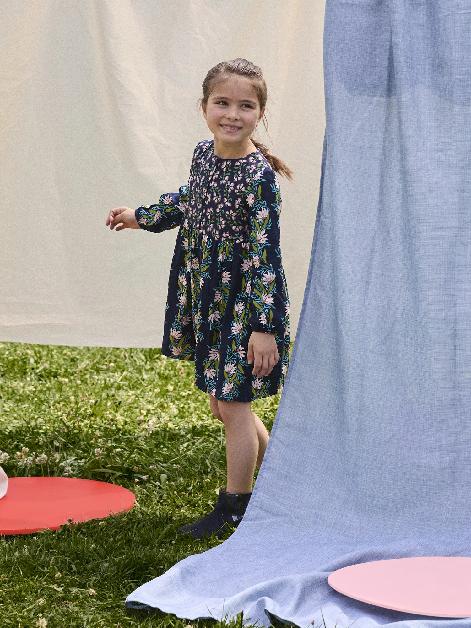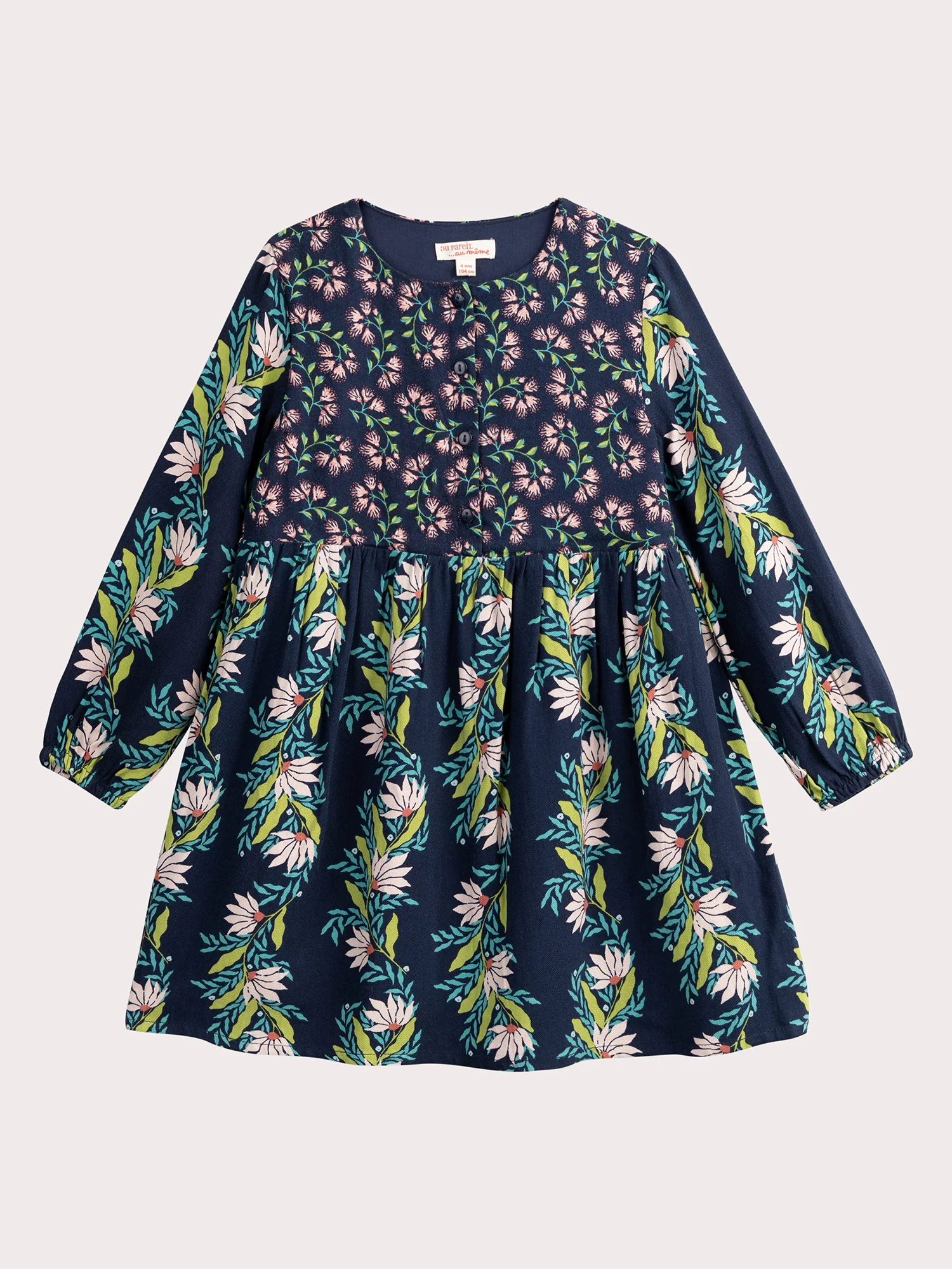 Pour les petites fleurs des champs au style boheme, cette robe marine à l’imprimé façon patchwork fleuri est un véritable coup de cœur. Confectionnée en viscose légere, elle offre une sensation de douceur et de liberté à votre fille. Ses manches élastiquées ajoutent une touche de confort et de féminité, tandis que l’ouverture boutonnée au dos facilite l’habillage. Cette robe est parfaite pour les journées ensoleillées où votre fille veut rayonner avec élégance et style.
