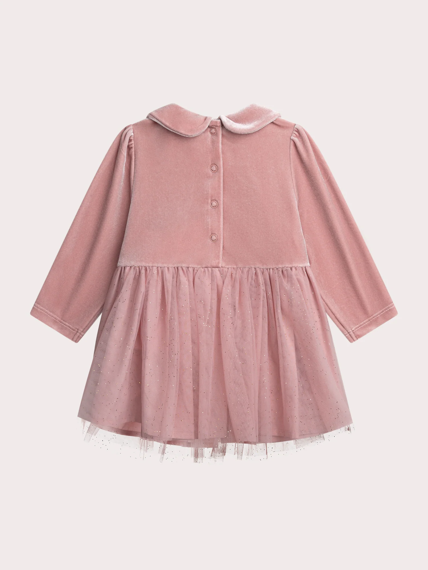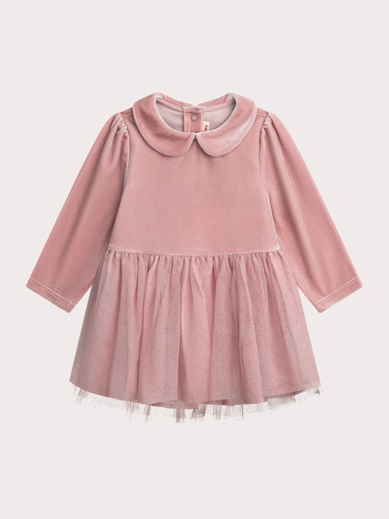 Cette robe nude en velours et tulle est parfaite pour les bébés filles, idéale pour les saisons fraîches. Elle offre douceur et élégance avec son col Claudine et son ouverture pratique dans le dos. Sa coupe délicate en fait un vêtement à la fois confortable et raffiné.