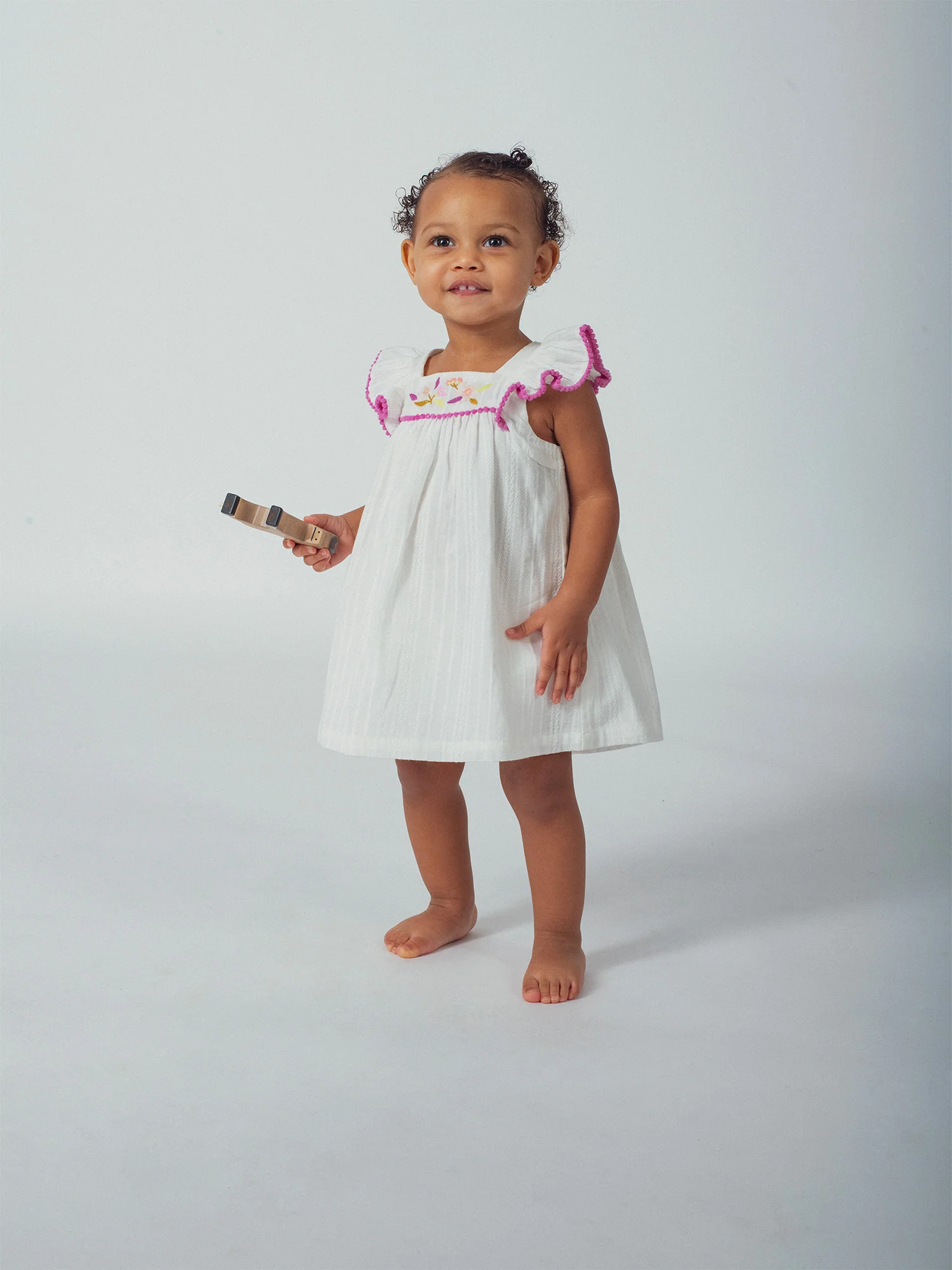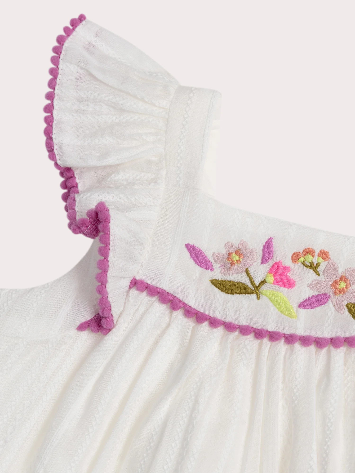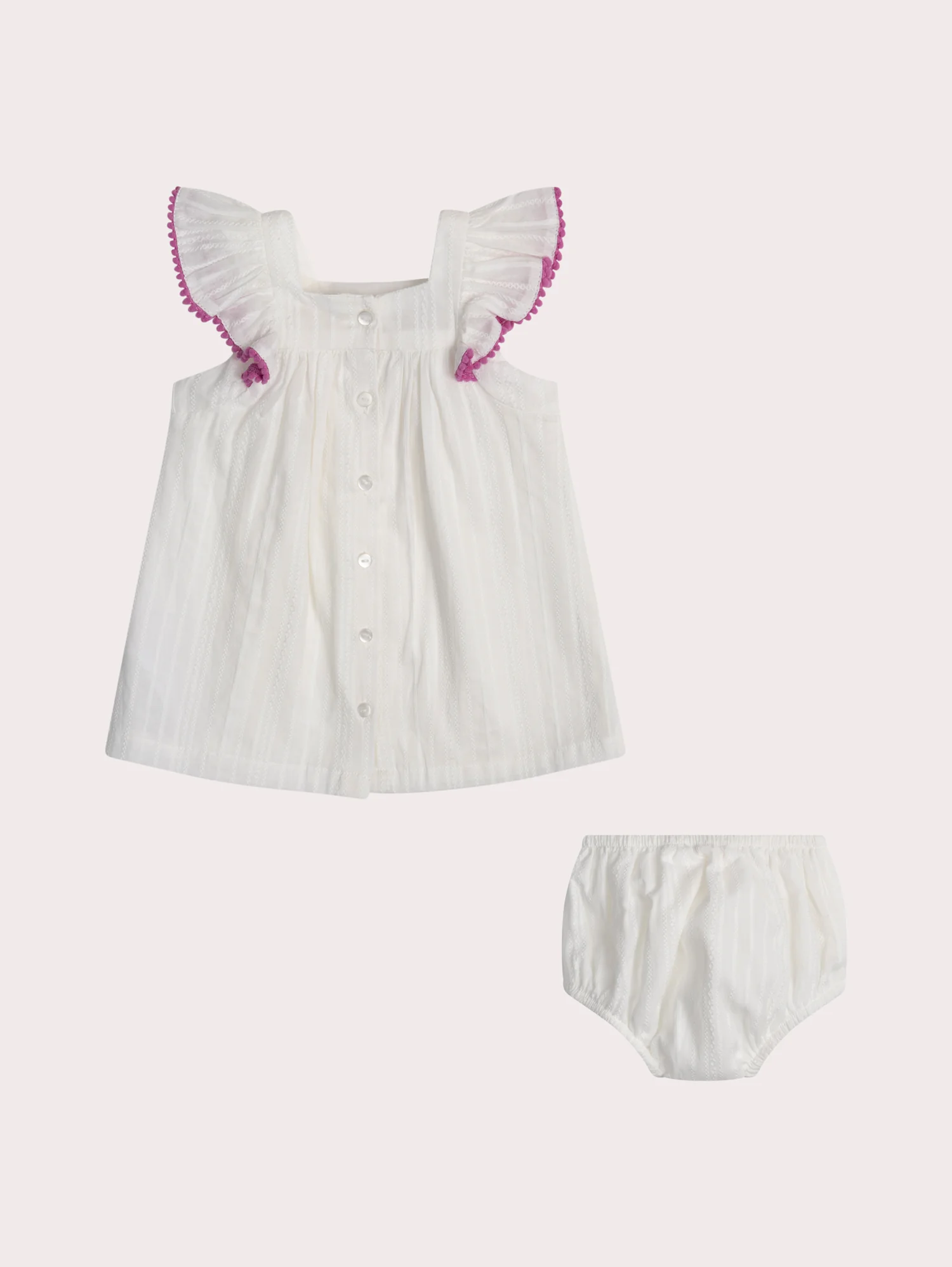 Pour les petites filles élégantes, cette robe péruche est idéale pour les journées ensoleillées. Confectionnée en voile de coton léger, elle assure confort et fraîcheur, avec des manches volantées pour une touche de douceur. L’imprimé péruche fleuri et le bloomer assorti apportent une touche printanière et pleine de charme à ce modèle.
