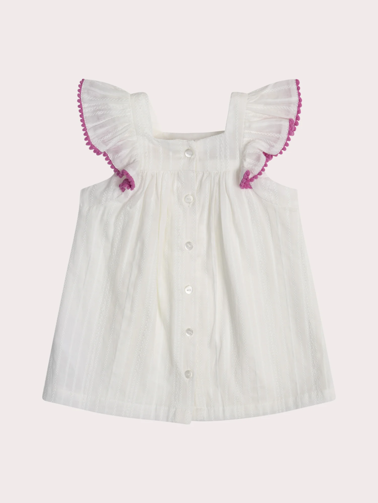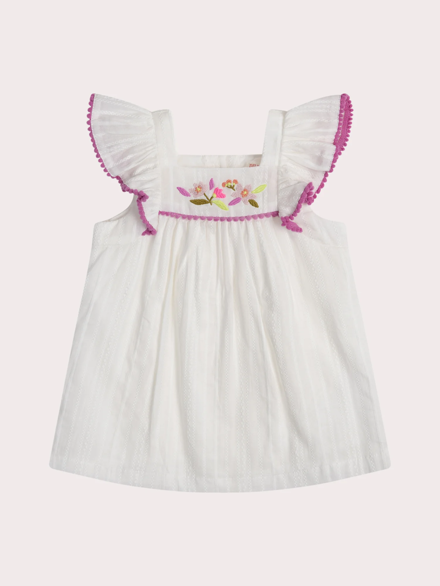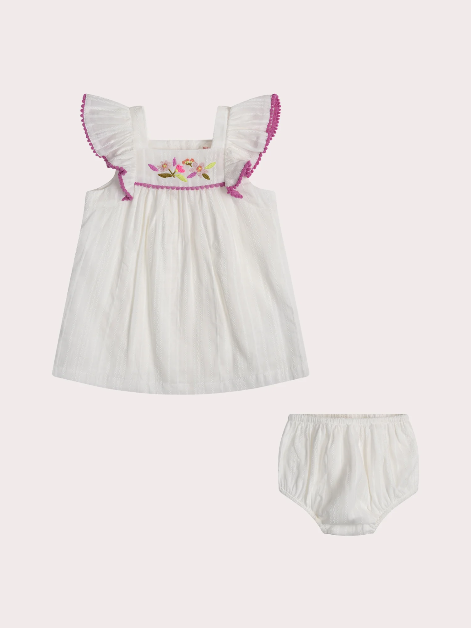 Pour les petites filles élégantes, cette robe péruche est idéale pour les journées ensoleillées. Confectionnée en voile de coton léger, elle assure confort et fraîcheur, avec des manches volantées pour une touche de douceur. L’imprimé péruche fleuri et le bloomer assorti apportent une touche printanière et pleine de charme à ce modèle.