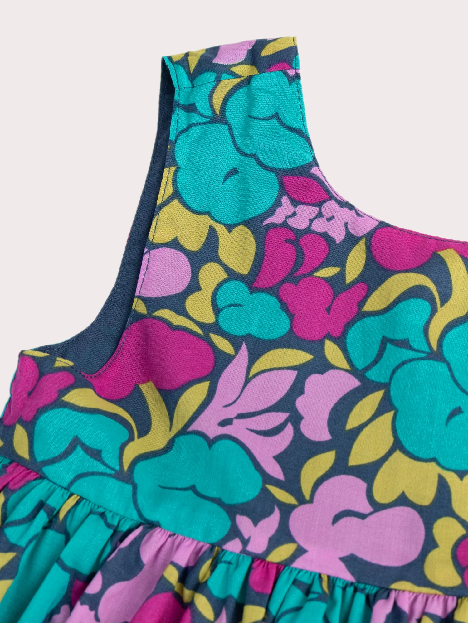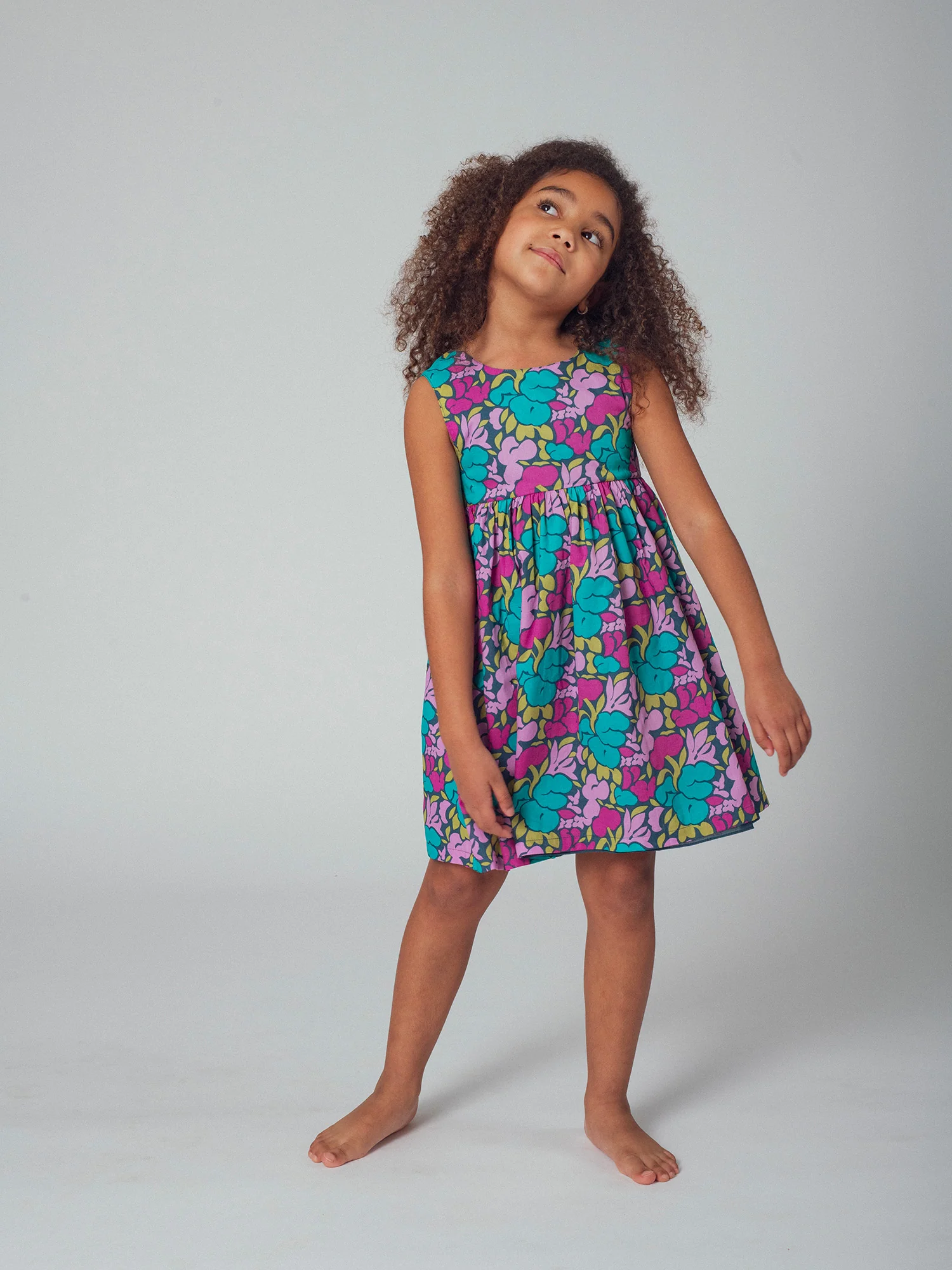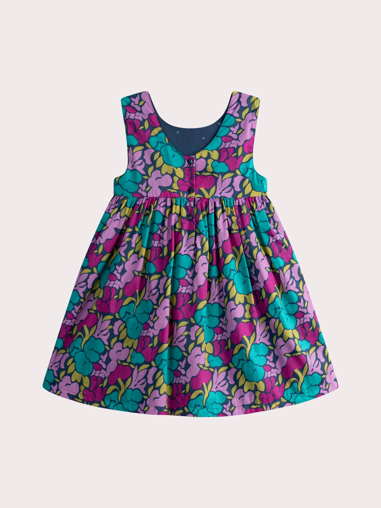 Pour les petites filles qui aiment changer de look facilement. Cette robe réversible en coton offre deux styles : une face imprimée floral et l’autre à pois métallisés, avec une ouverture par boutons à l’arriere pour plus de praticité. Une piece idéale pour varier les tenues au quotidien.