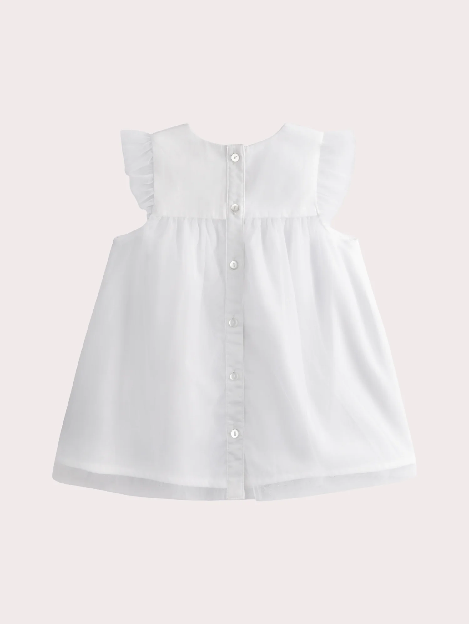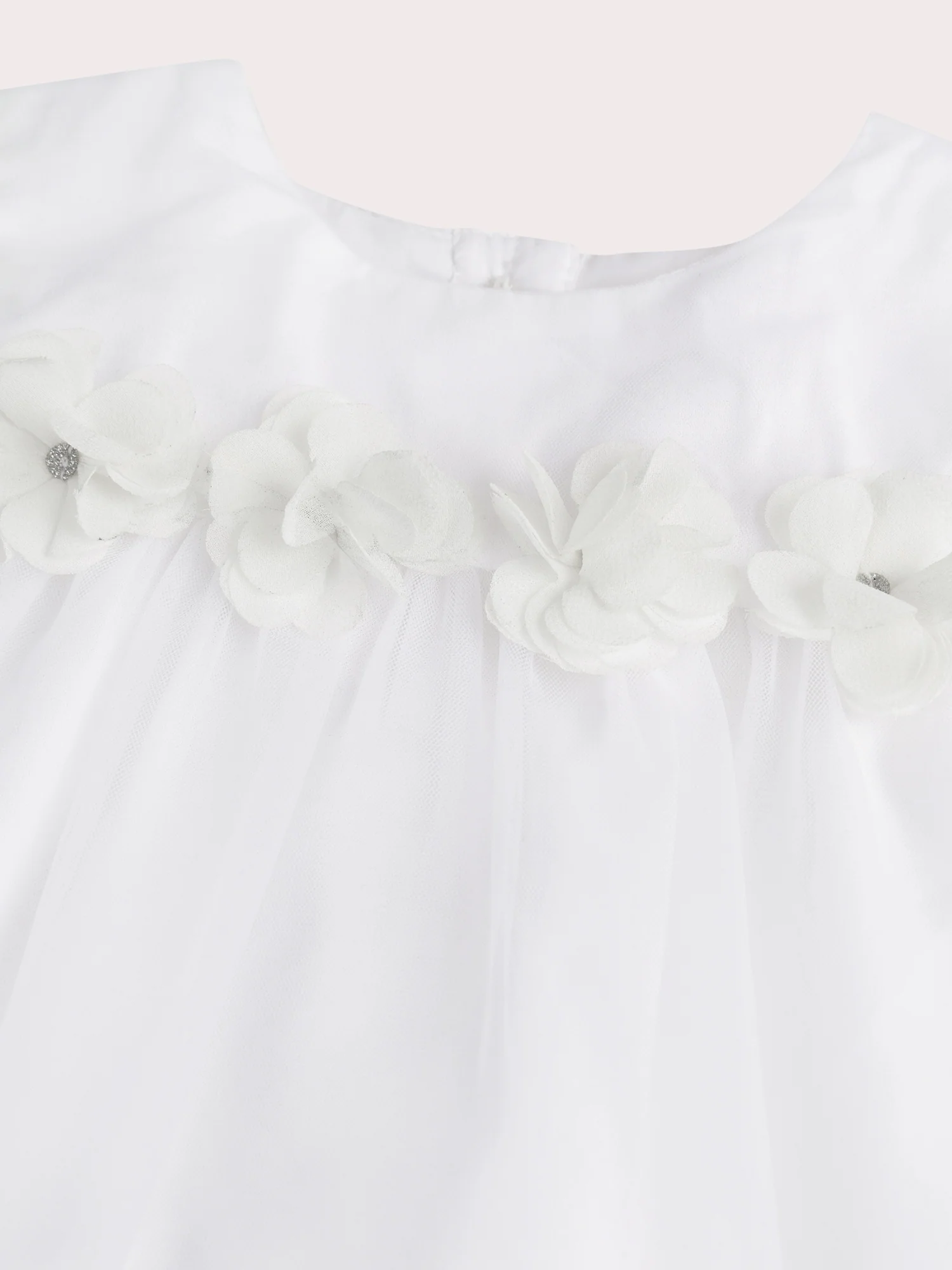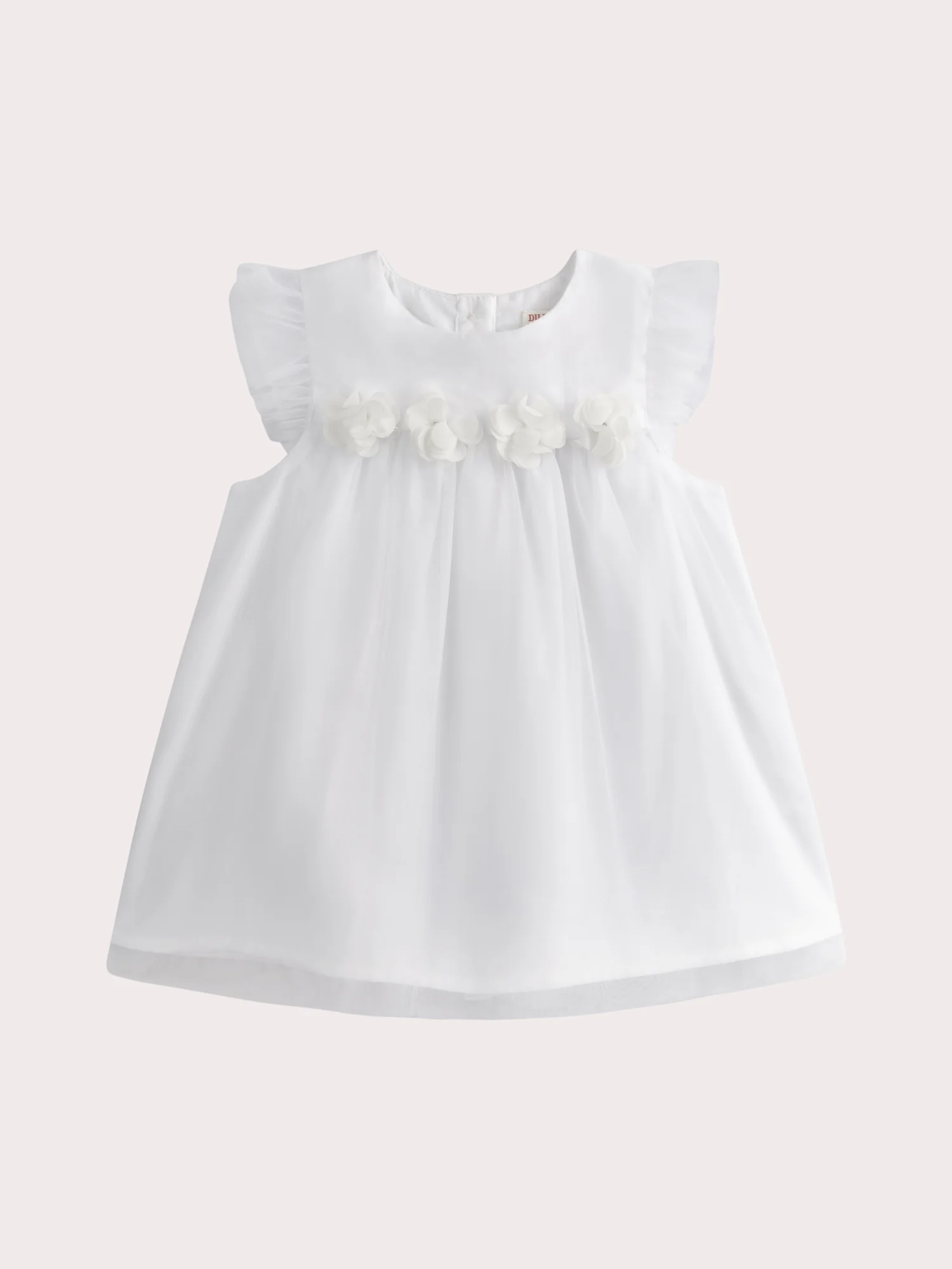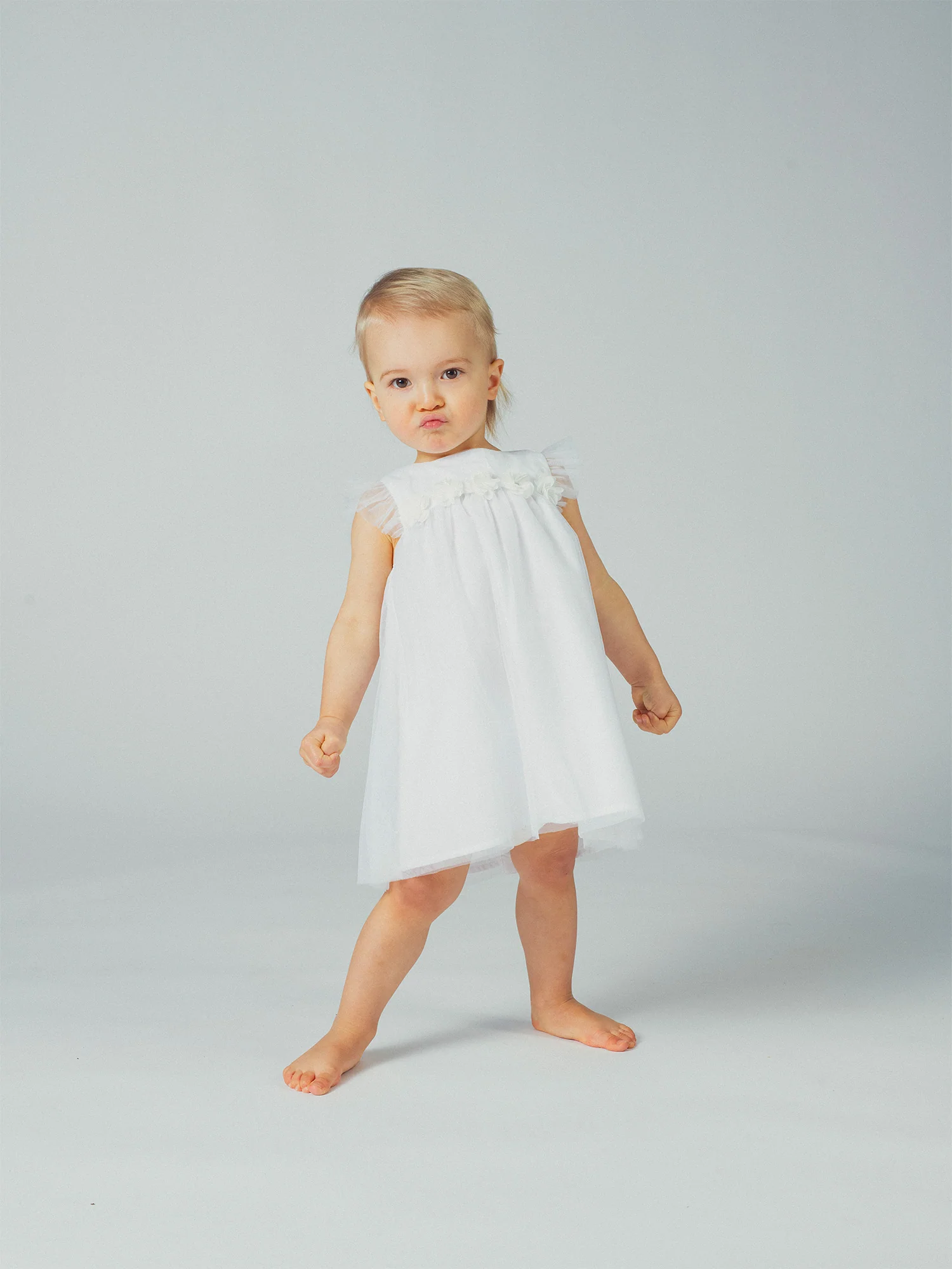 Cette robe unie écrue pour bébé fille, en tulle léger et doublée de satin de coton, offre une élégance délicate. Les fleurs en relief sur le devant ajoutent une touche de charme. Pratique et chic, elle s’ouvre par des boutons au dos pour un enfilage facile.