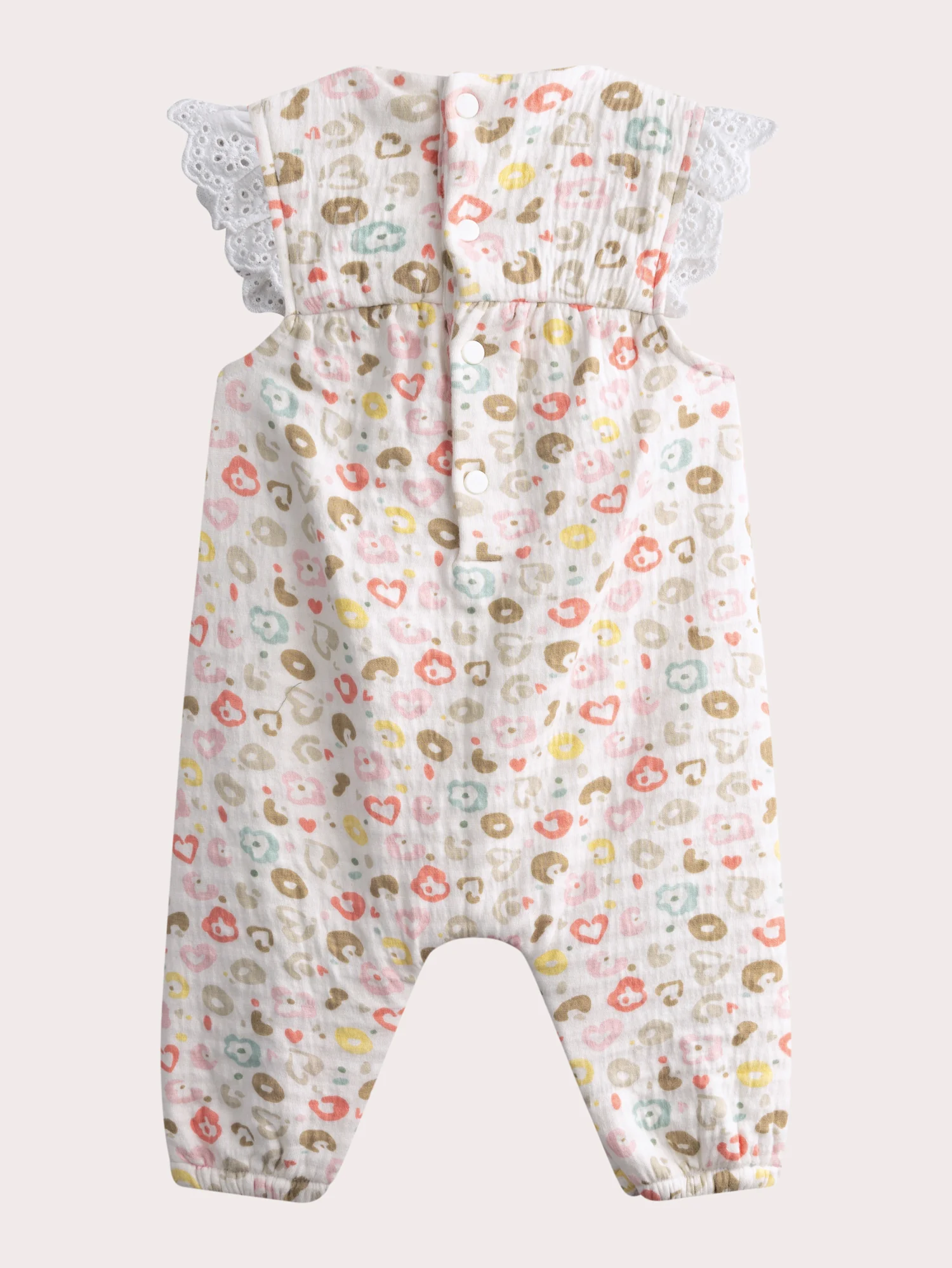 En tubique de coton, moelleux et confortable Imprimé panthère Haut de la salopette doublé en jersey de coton Manches volantées en broderie anglaise Ouverture dos et entrejambes par boutons pressions Bas de jambes élastiquées Vous pouvez accéder à la fiche produit relative des qualités et caractéristiques environnementales en cliquant ICI.