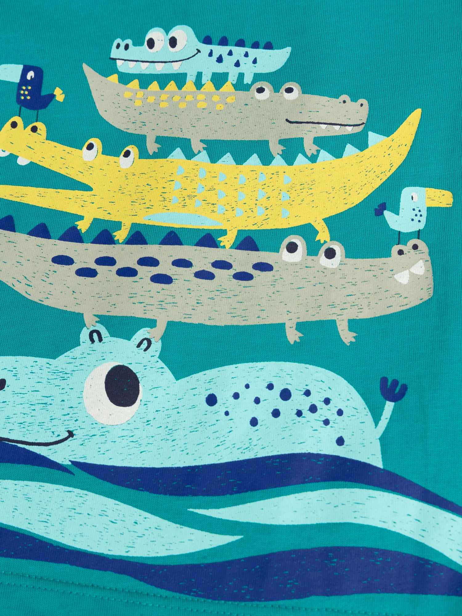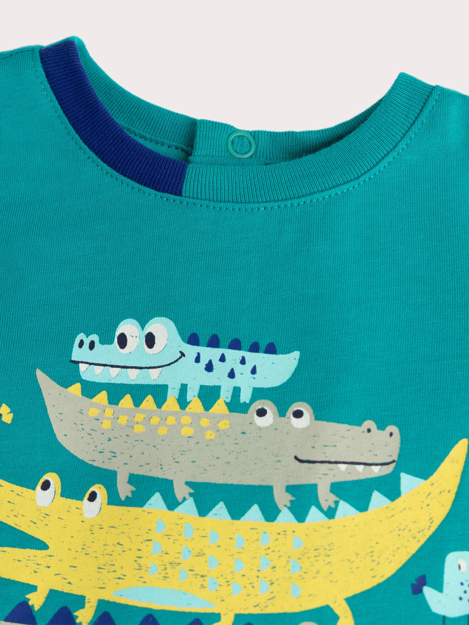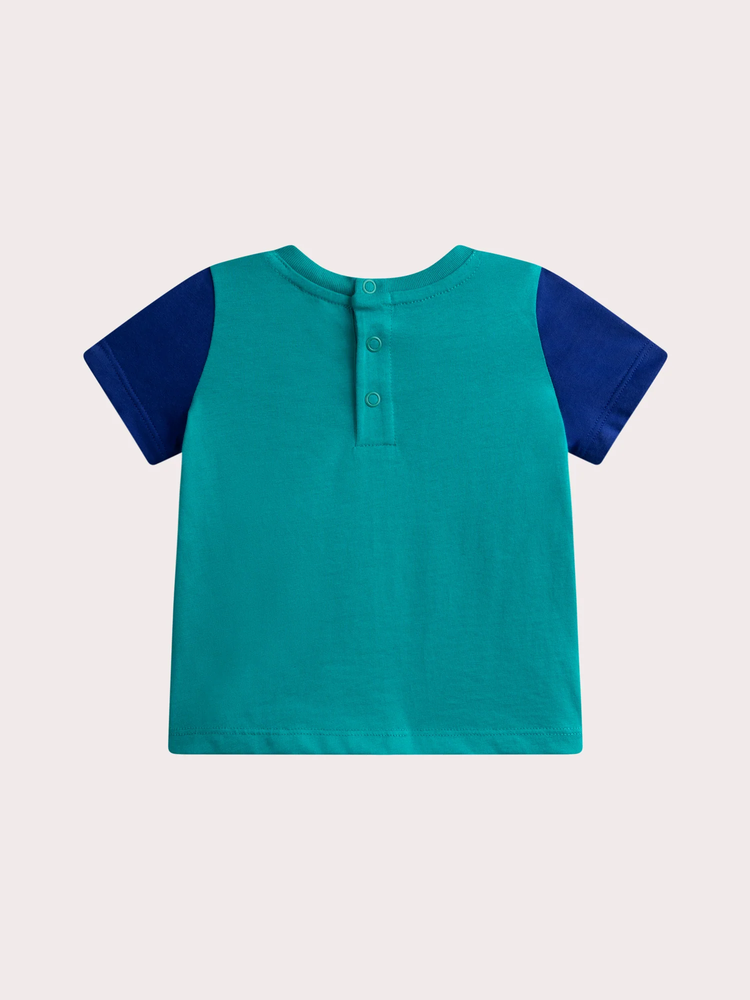 Pour les bébés garçons curieux et joyeux, idéal pour les journées ensoleillées. Ce t-shirt turquoise en jersey est doux et confortable, avec une ouverture à pression au dos pour un habillage facile. Son animation avec des animaux apporte une touche ludique et amusante.