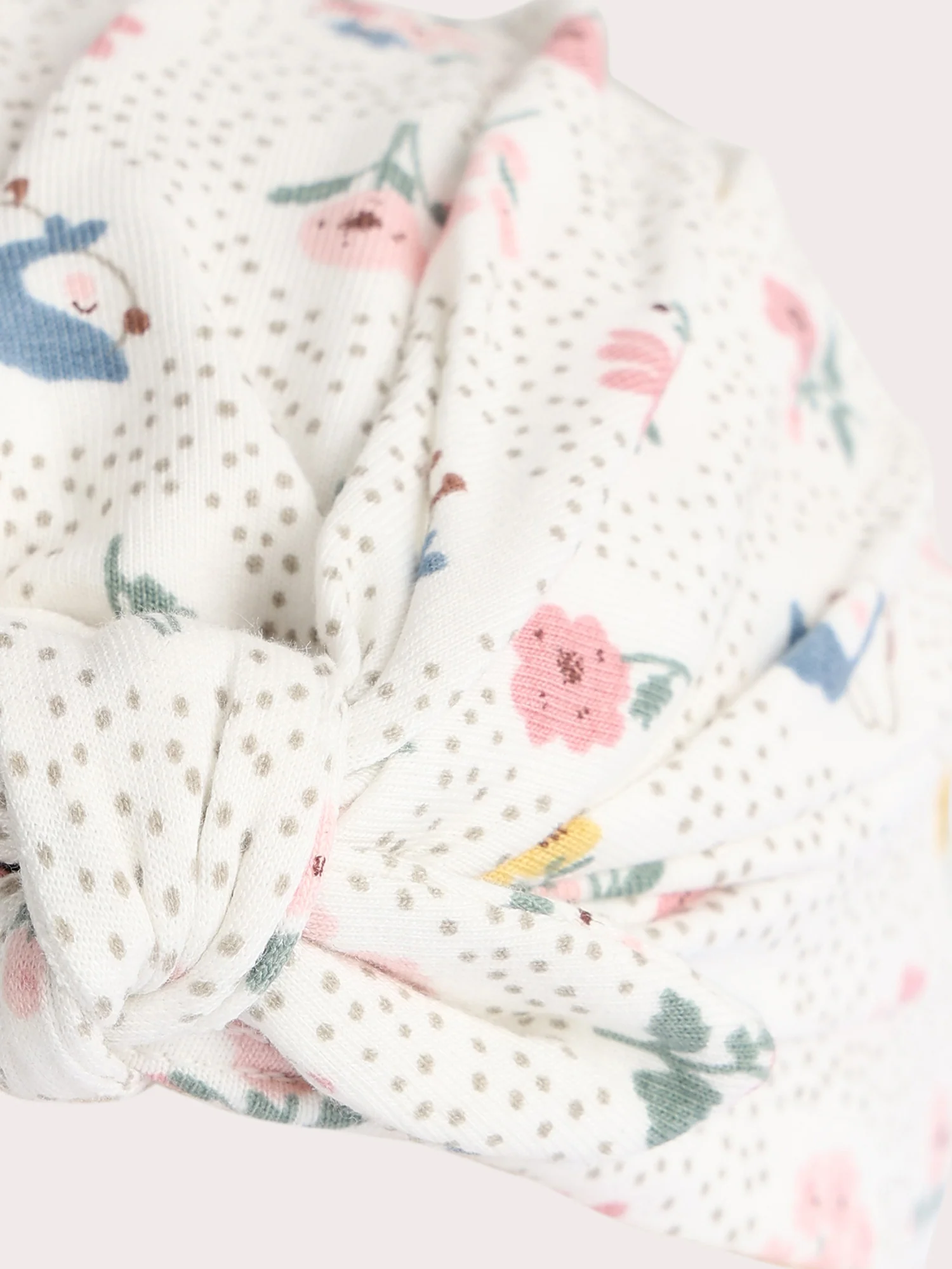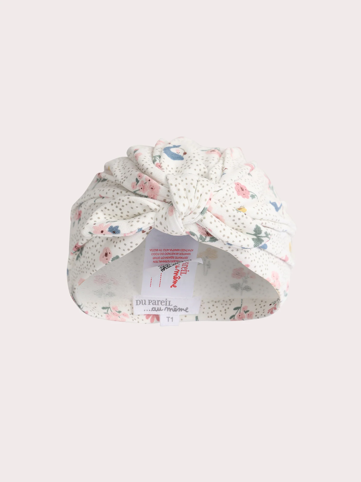 Ce turban imprimé est parfait pour les petites filles élégantes, idéal pour ajouter une touche de style en toute saison. Confectionné en molleton (french terry), il assure confort et douceur pour la tête de bébé. Son design imprimé ajoute une note tendance et adorable à toutes les tenues.