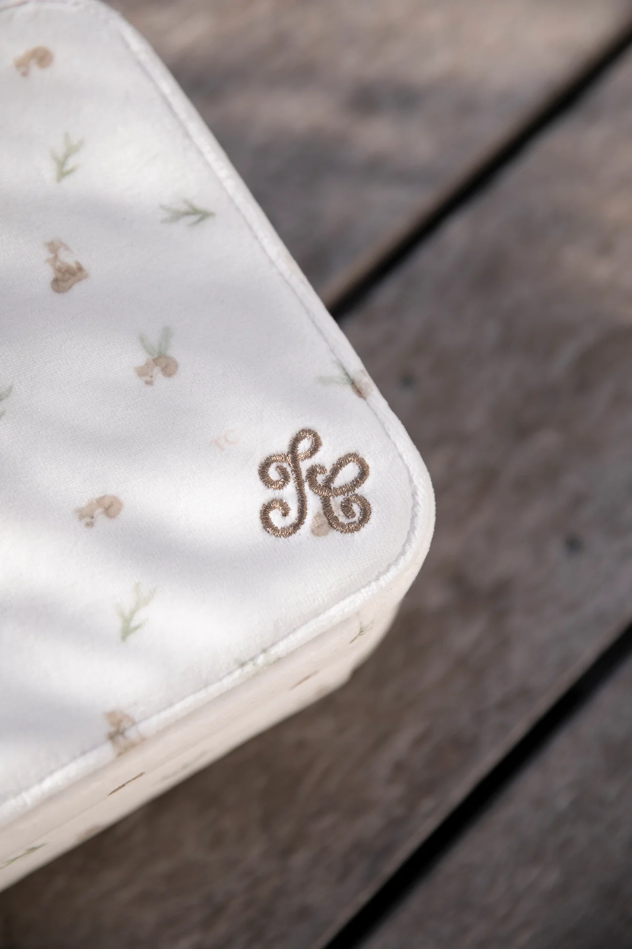 Cette valisette naissance au délicat motif à renards sur fond nacre, dans un nuage de velours, et un cadeau parfait pour petite fille, ou pour ranger doudous et peluches de bébé